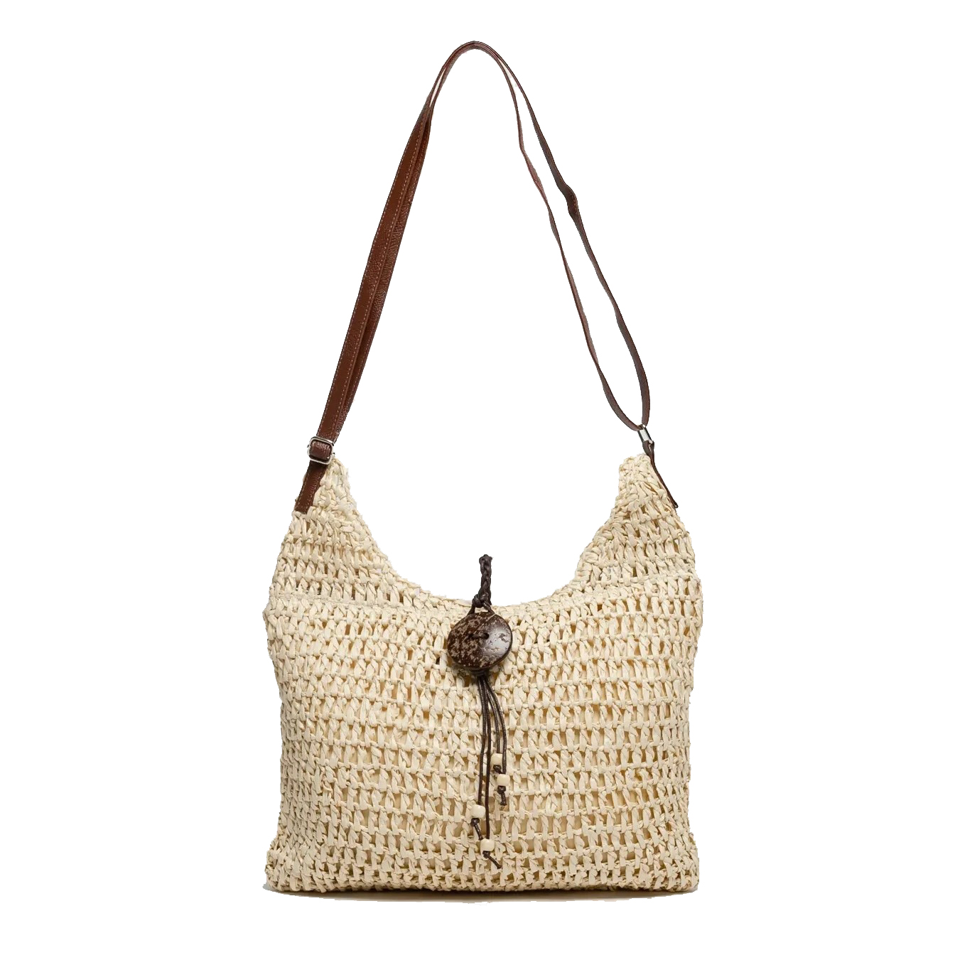 Bolso de Hombro para Mujer con Material de Rafia Correa Ajustable Cierre de Boton con Flecos y Bolsillo Interior