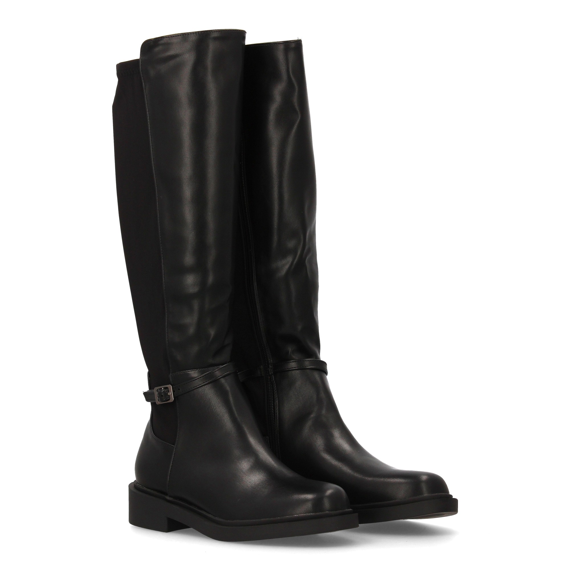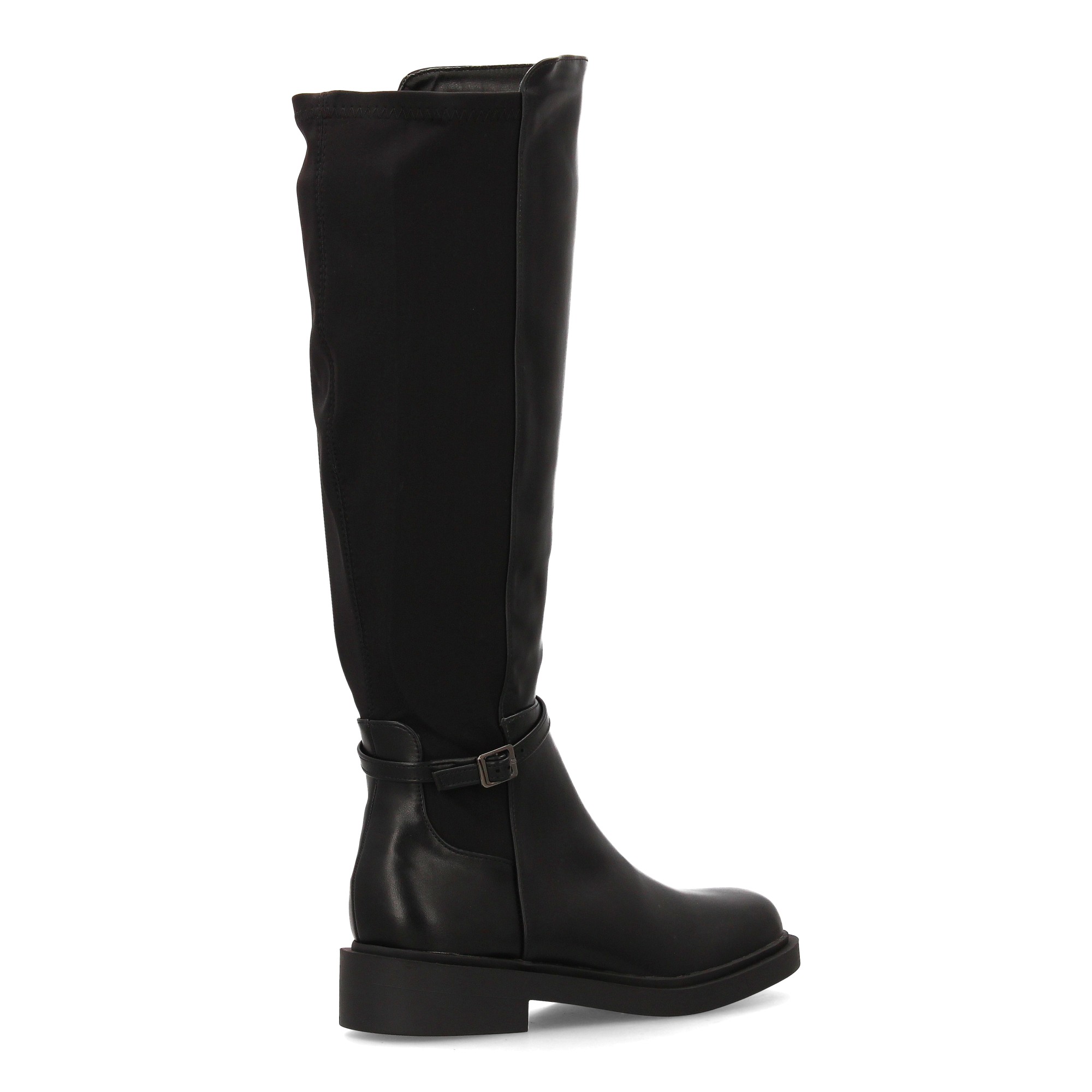 Bota alta para mujer con caña combinada en material sintético y tejido elástico. Su diseño tipo ecuestre incorpora una hebilla decorativa en el tobillo y suela plana con tacón bajo para el día a día