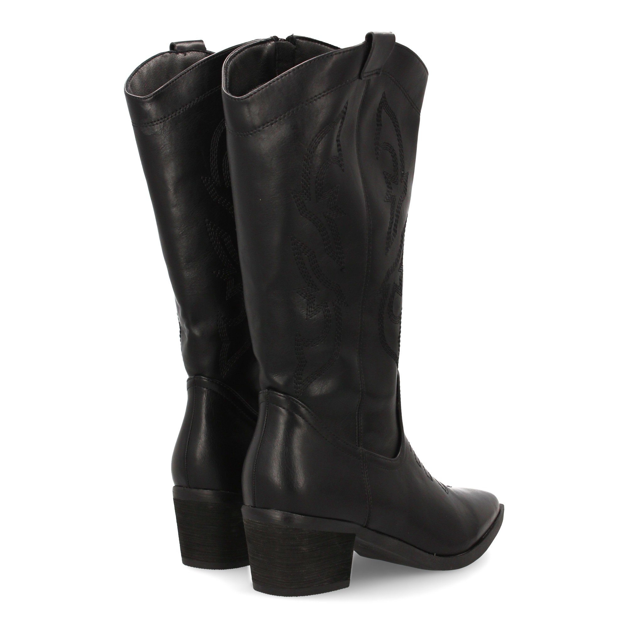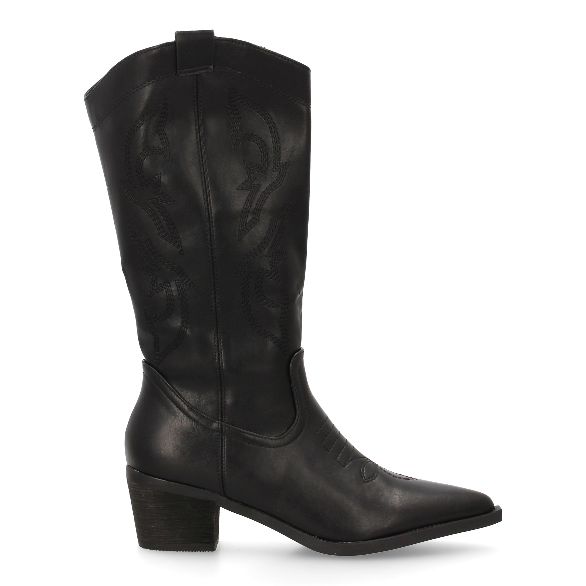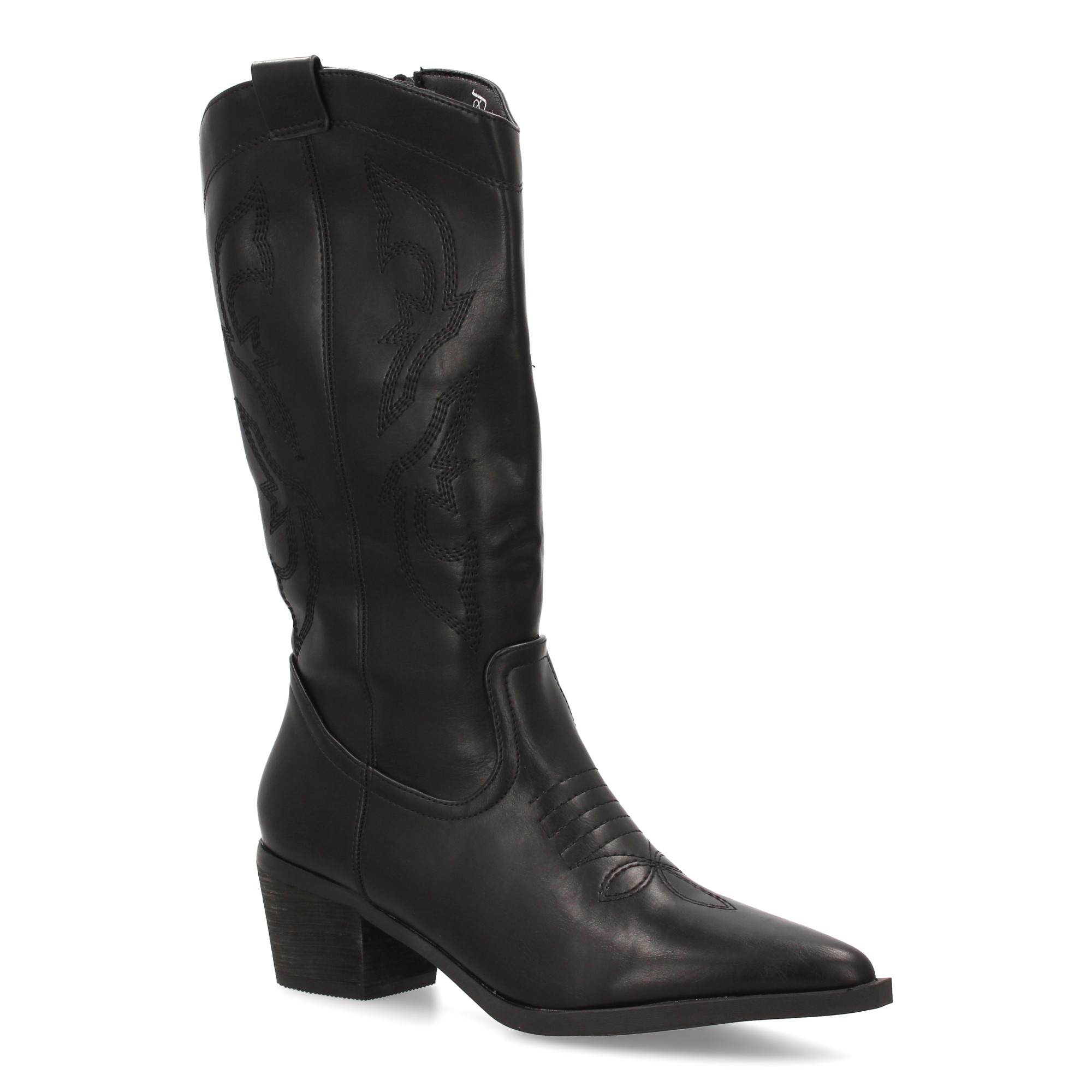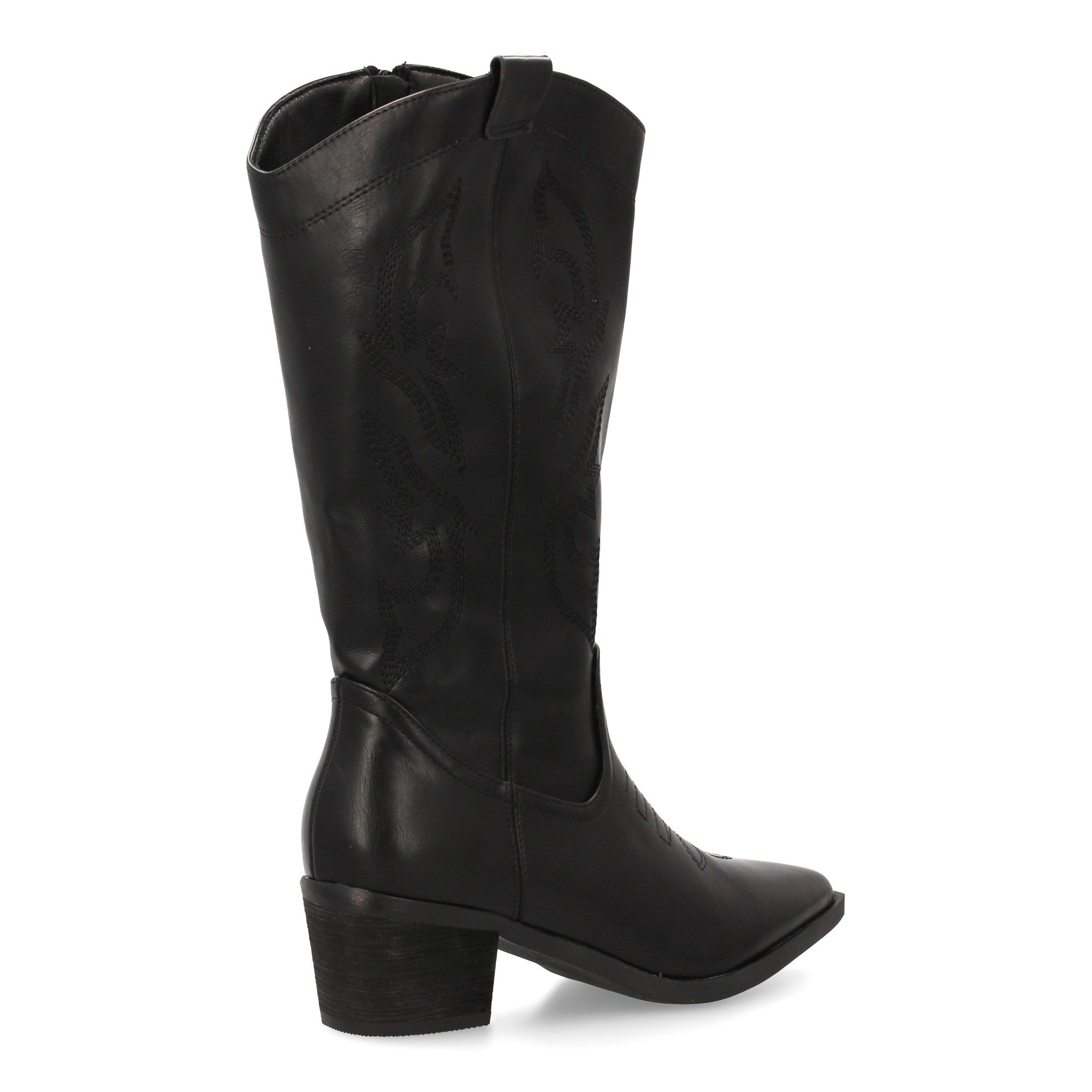Bota cowboy de caña alta con bordados laterales. Punta fina y tacón ancho cómodo. Estampado liso y cierre de cremallera. Para mujer ideal temporada otoño invierno.