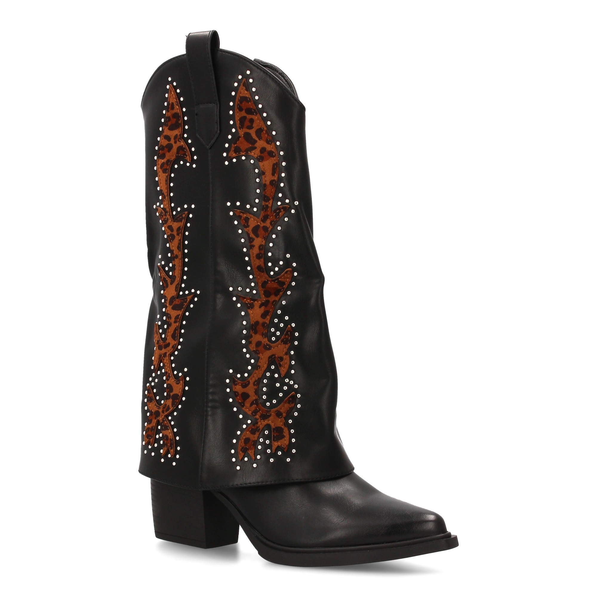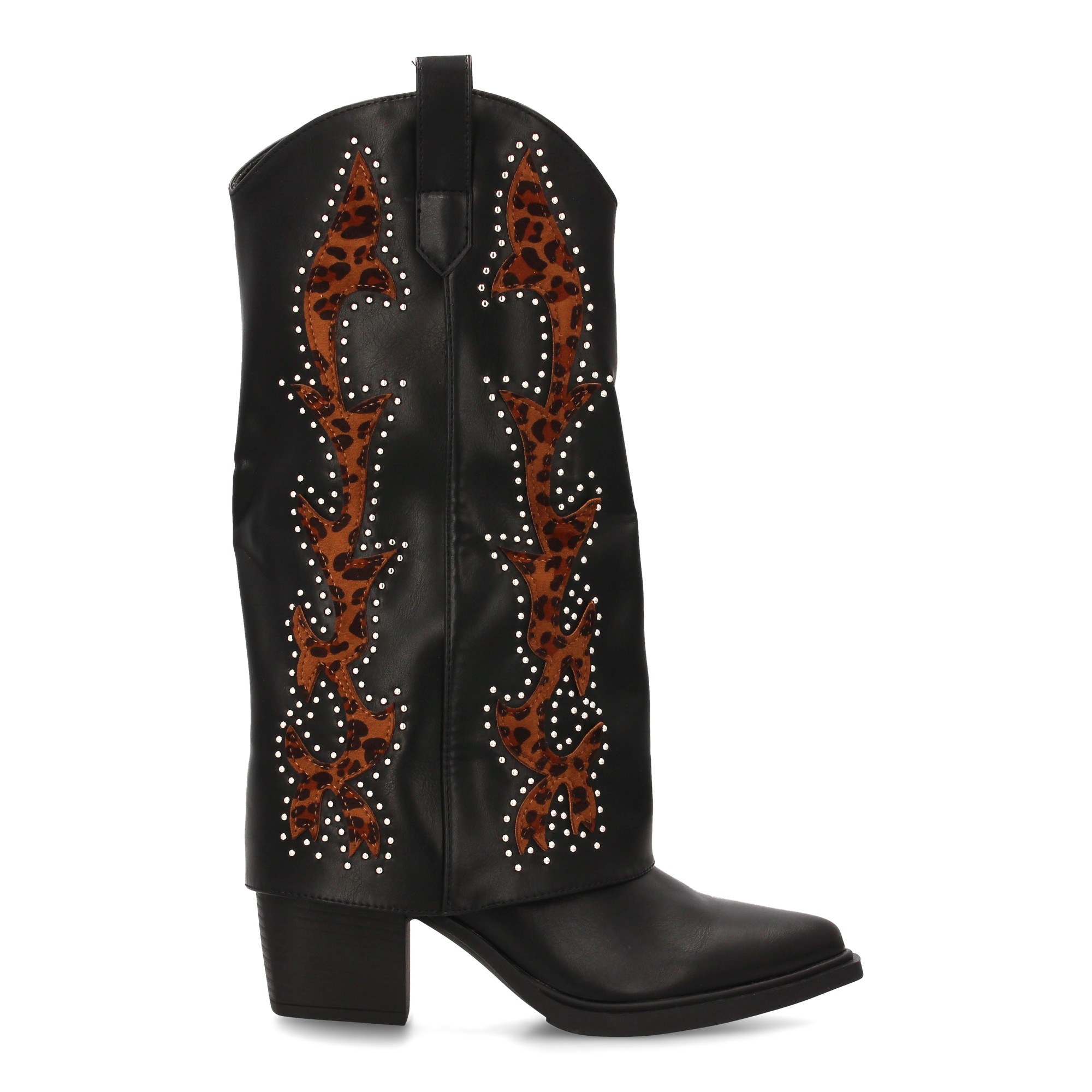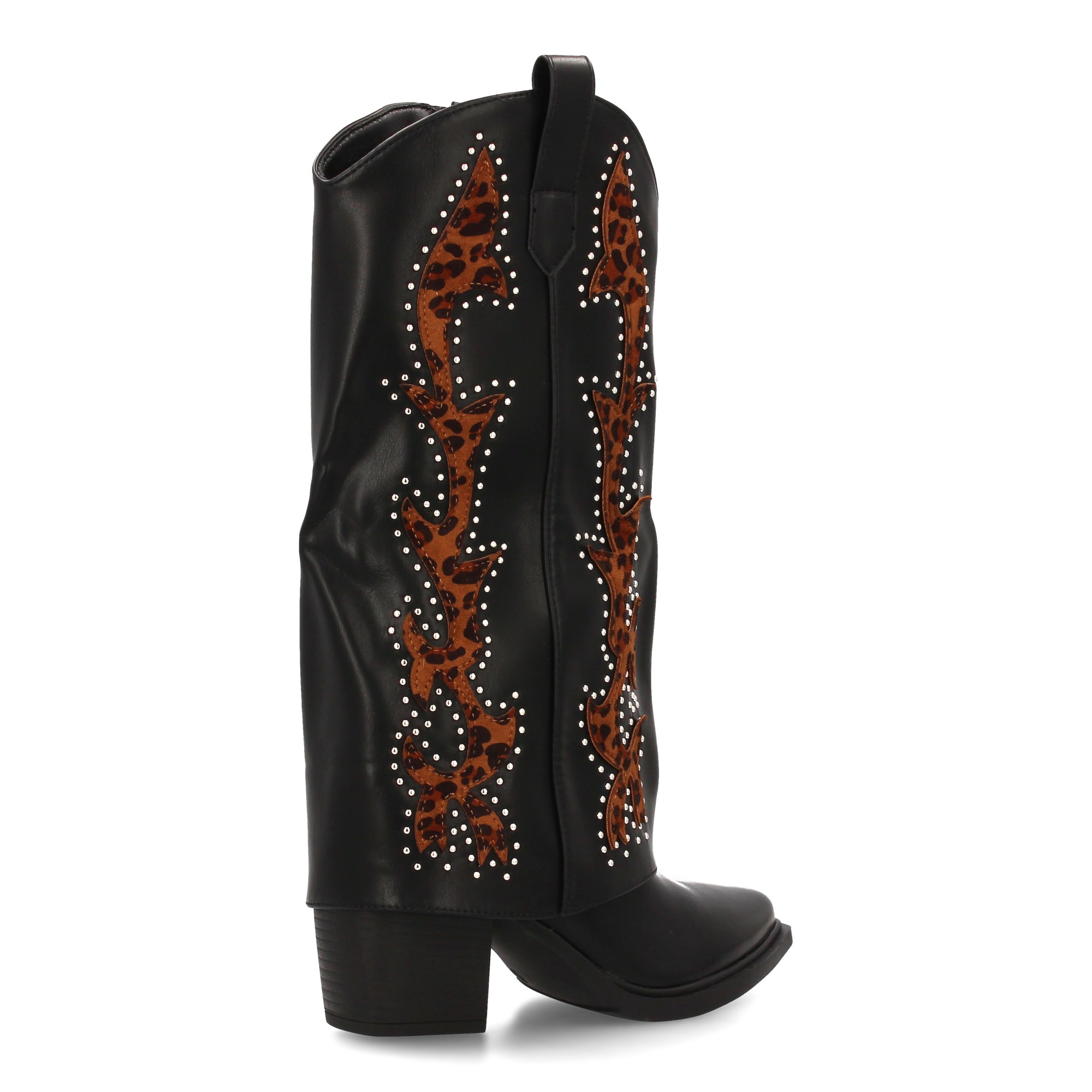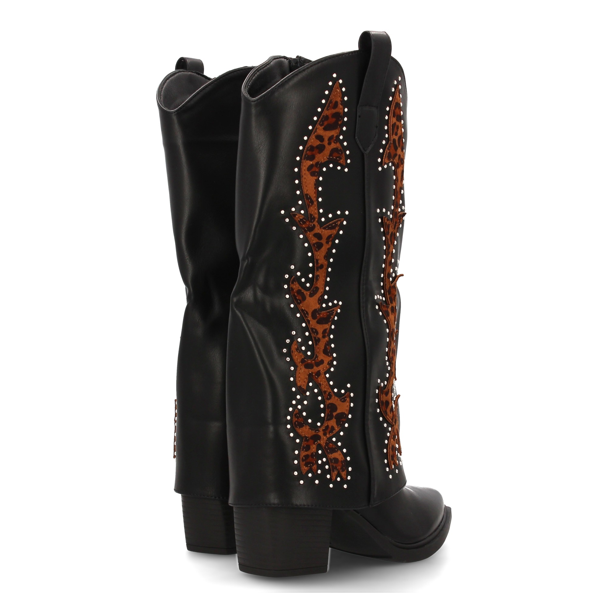Bota cowboy de caña alta con bordados estampados y tachuelas metálicas. Tacón ancho y comodo ideal para mujer temporada otoño invierno.