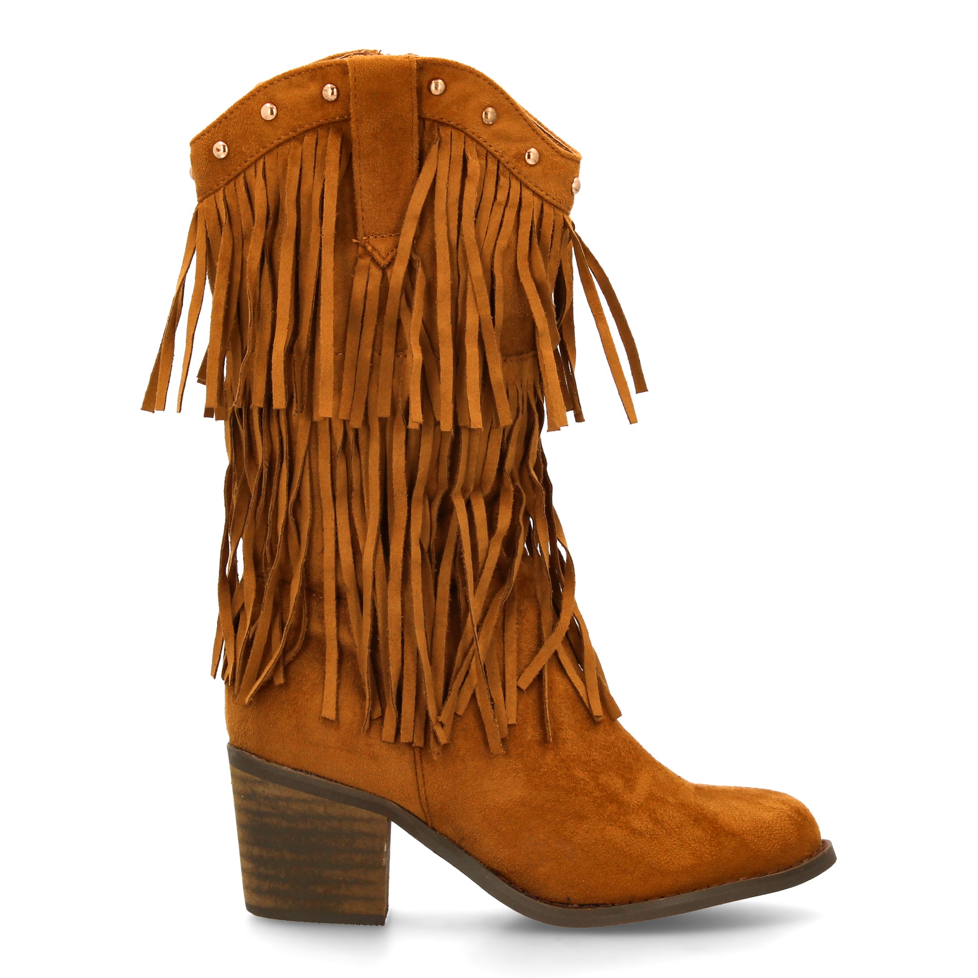 Bota cowboy con flecos para mujer. Acabado tipo ante varias capas de flecos. Tachuelas metálicas en la parte superior tacón ancho comodo. Ideal otoño invierno.