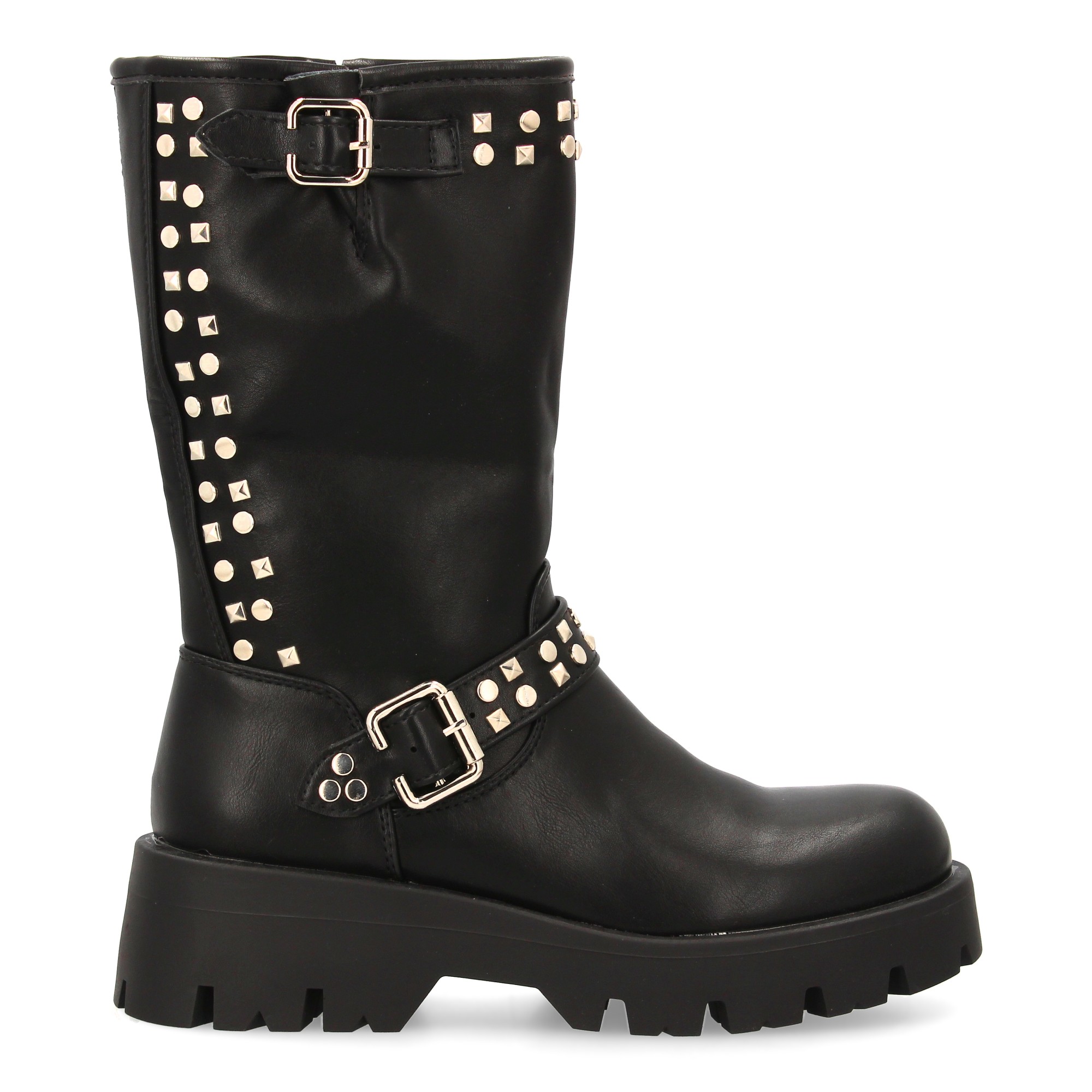 Bota de caña media con suela dentada y detalles de tachuelas metálicas. Con cierre de cremallera lateral y doble hebilla Plataforma comoda ideal para mujer temporada Otoño invierno.