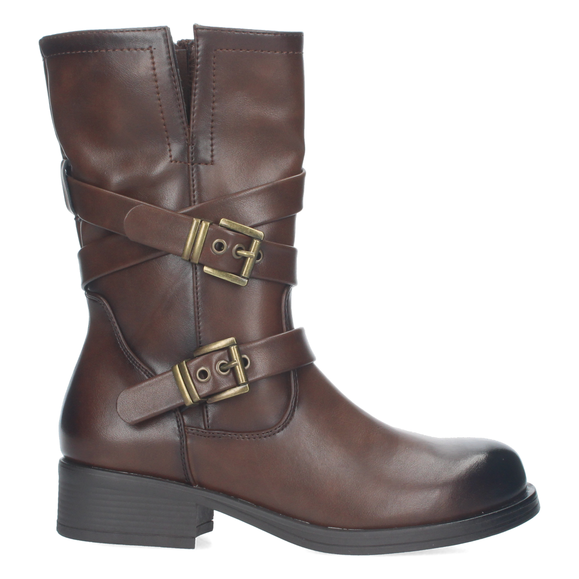 Bota motera de diseño liso con cierre de cremallera y hebillas que adornan la caña de 22’5cm. Perfectas para otoño e invierno y cómodas.