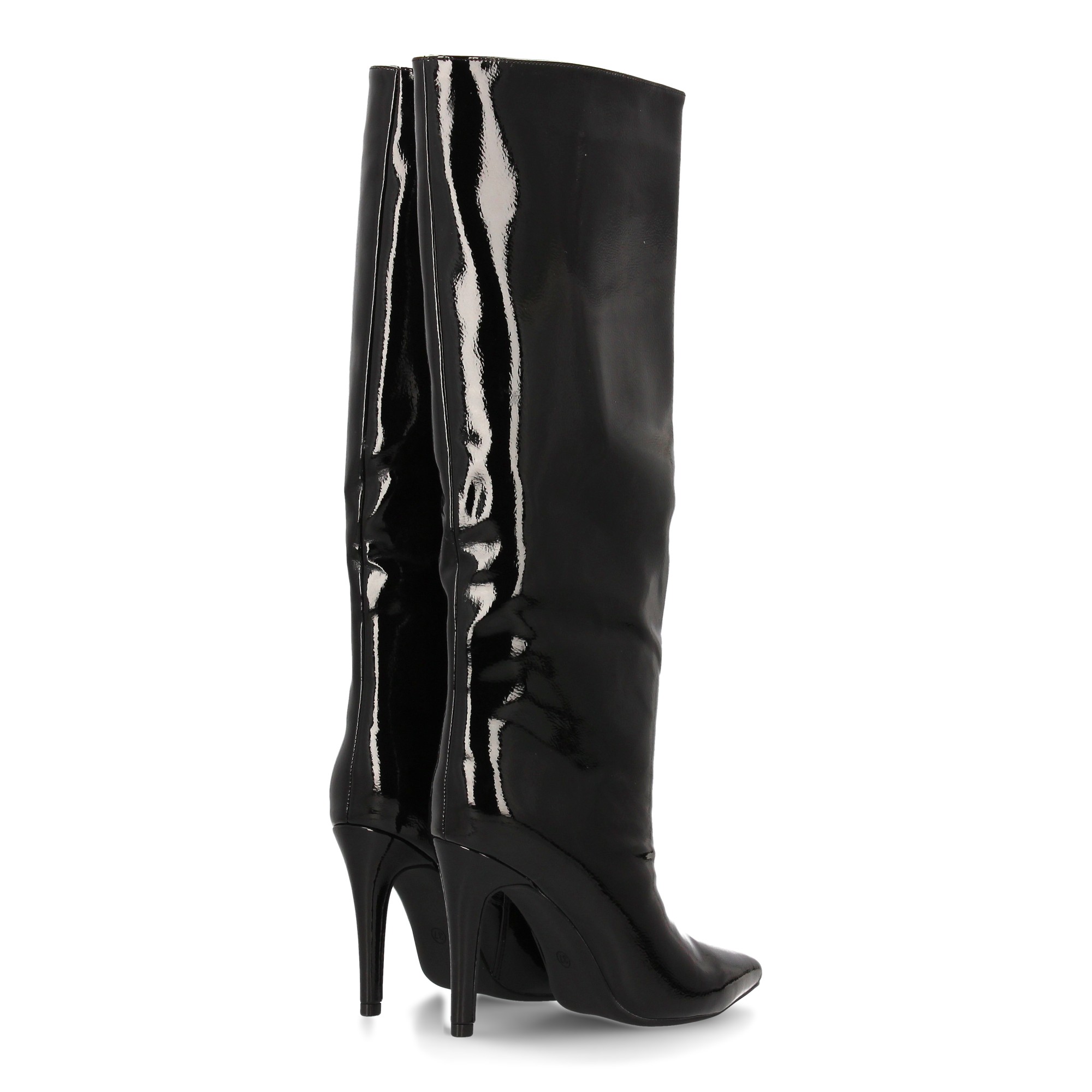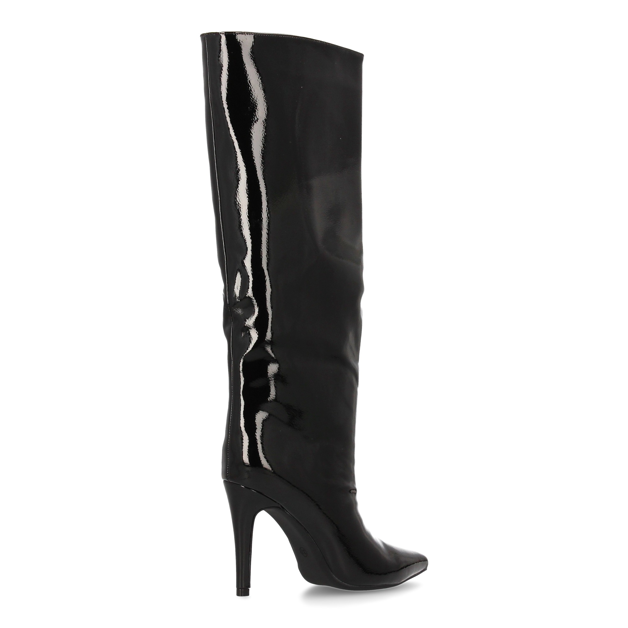 Bota alta mujer con efecto charol brillantes con cierre de cremallera y tacon y punta fina. Estampado liso ideal temporada otoño invierno.