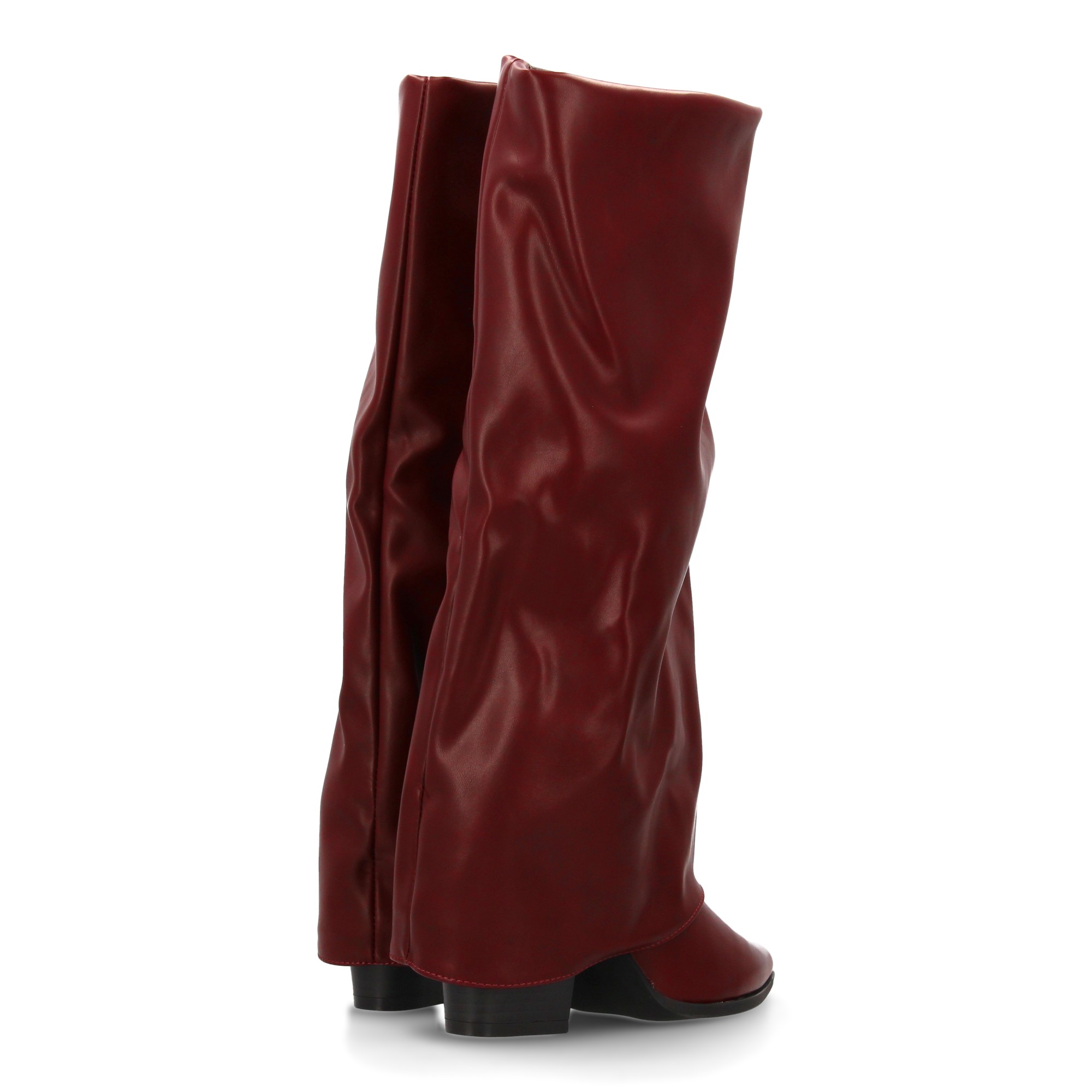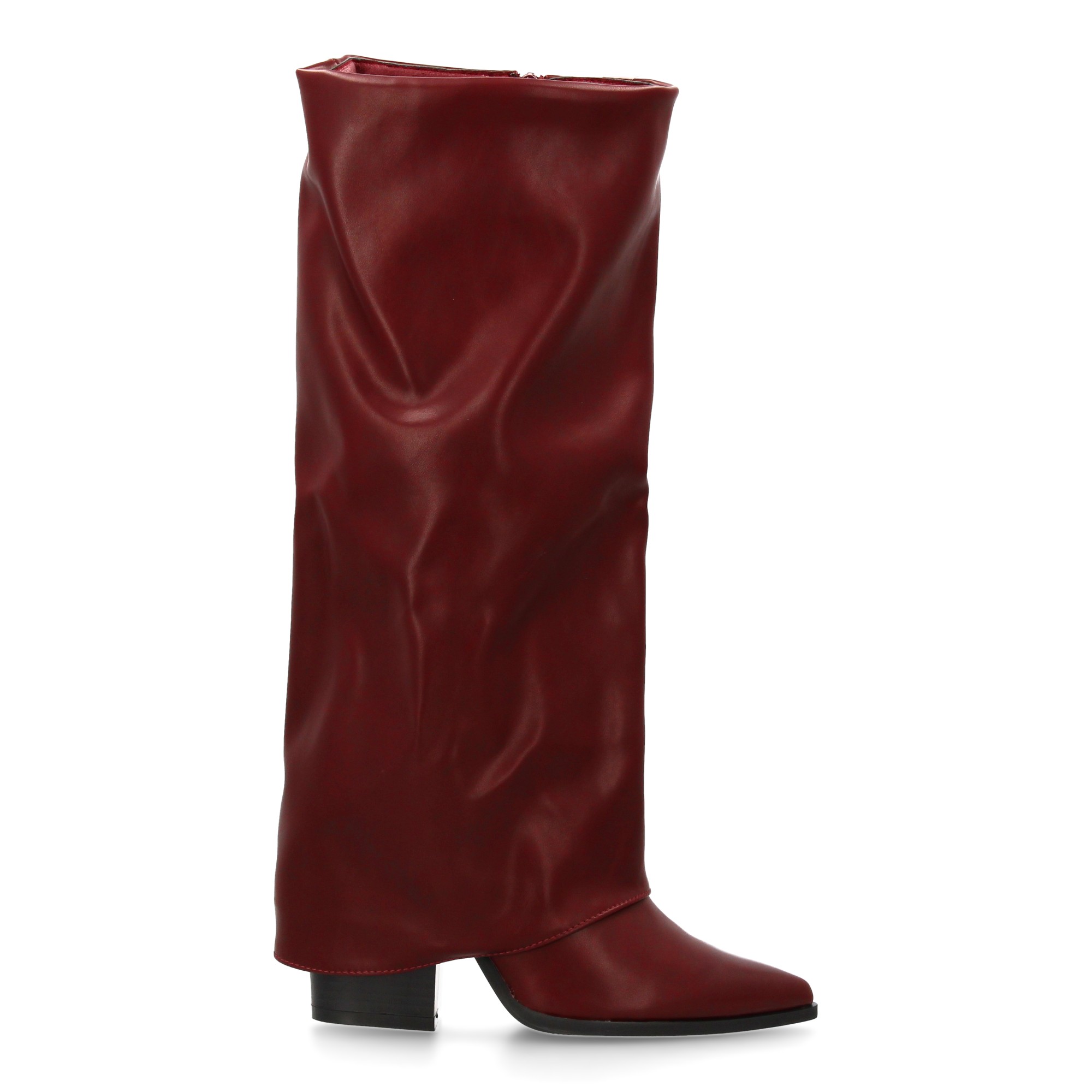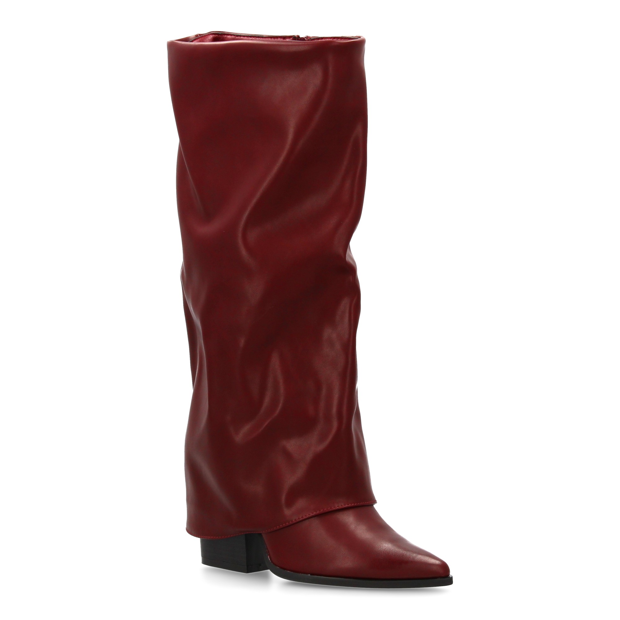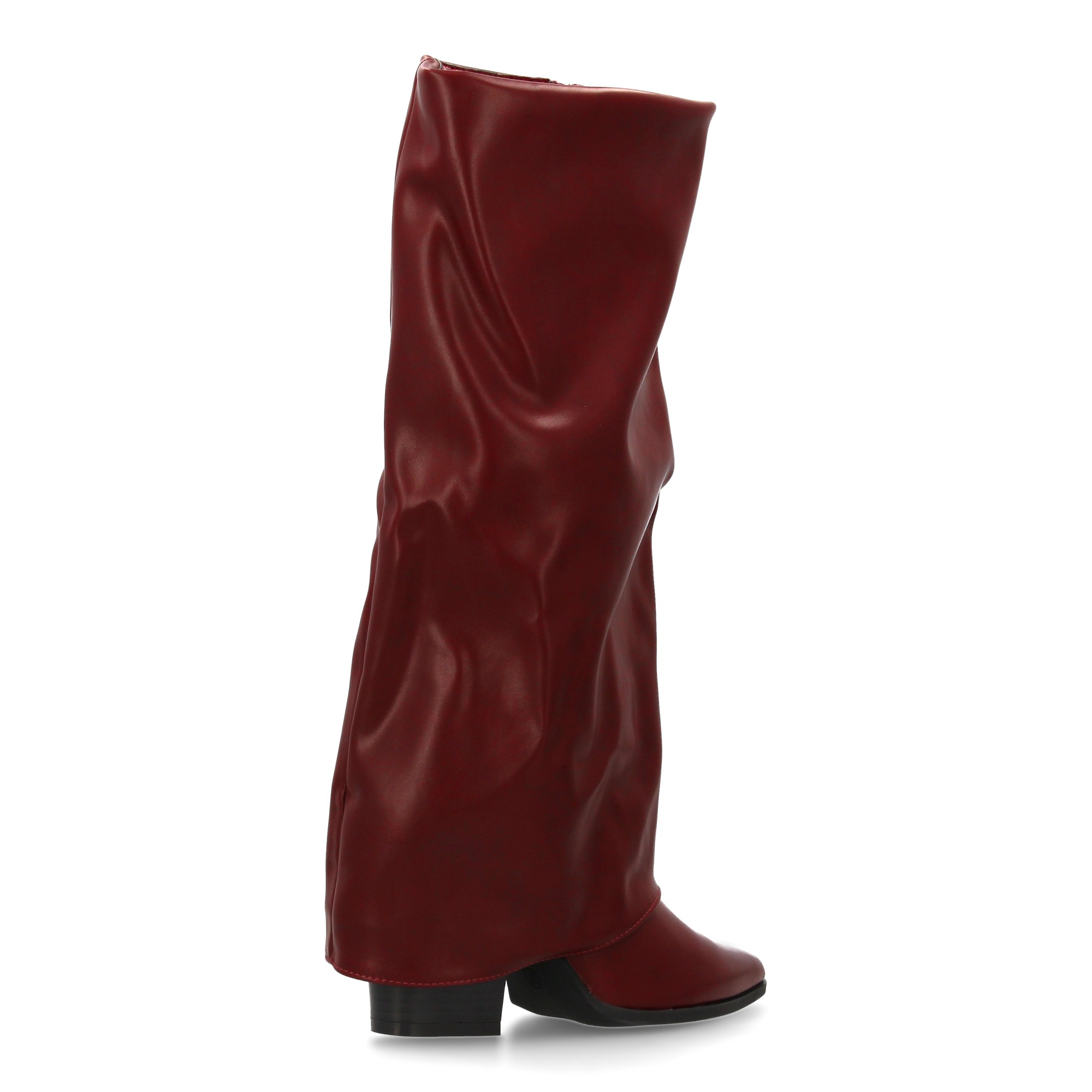 Bota alta de tacón para mujer con diseño moderno con acabado efecto arrugado elegante con punta fina y tacón ancho bajo. Ideal para temporada Otoño invierno.