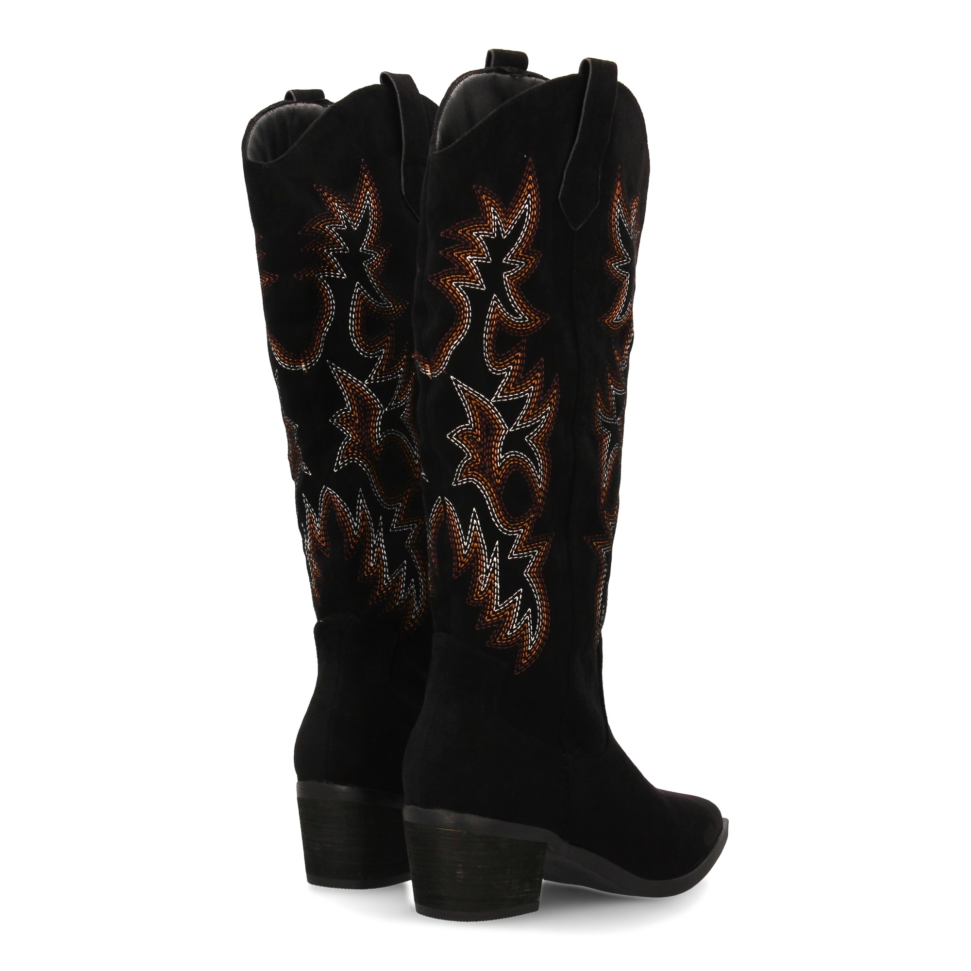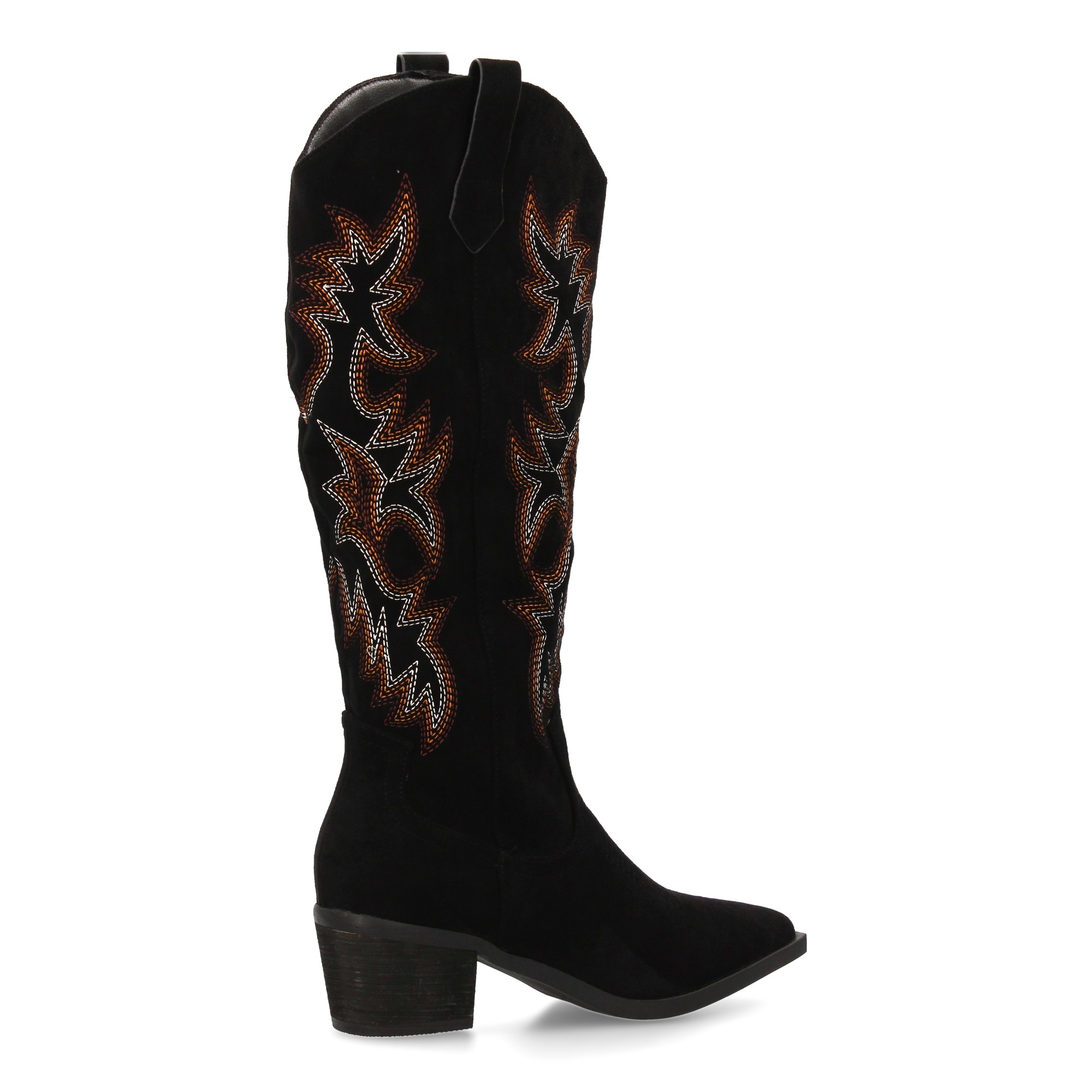 Botas camperas de mujer con caña alta y bordados estilo cowboy cierre de cremallera tacon comodo cubano punta fina. Estampado liso ideal para la temporada otoño invierno