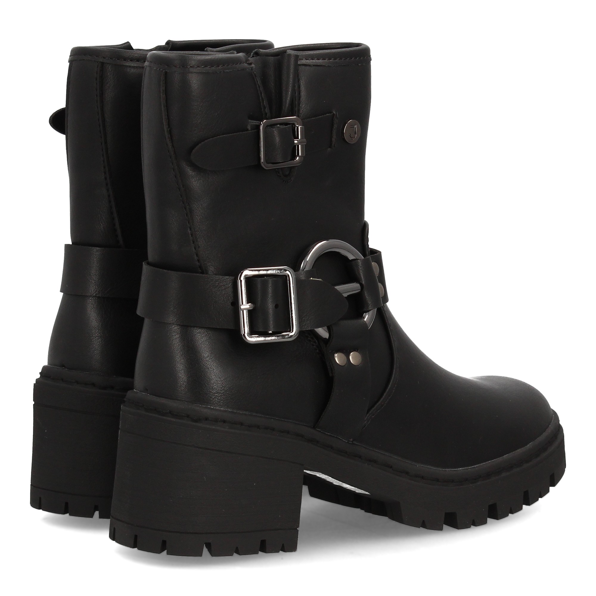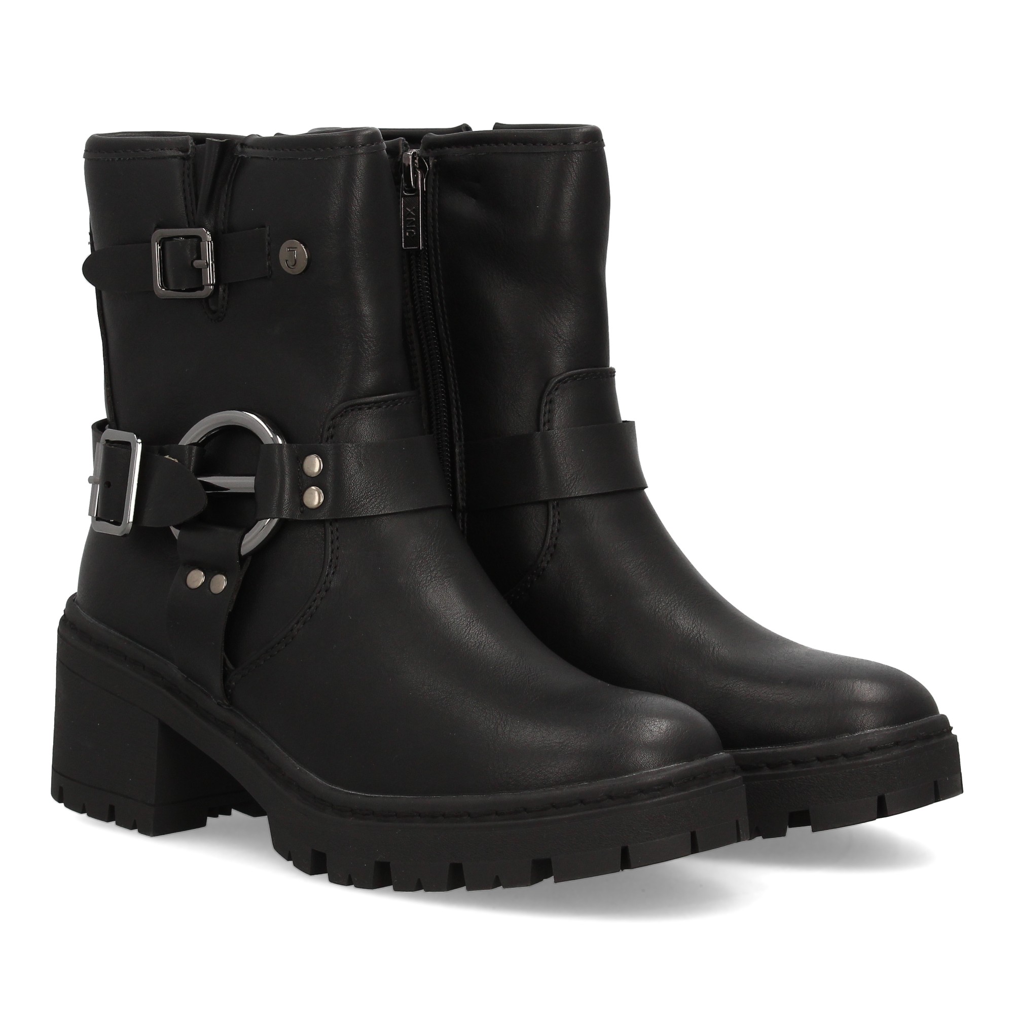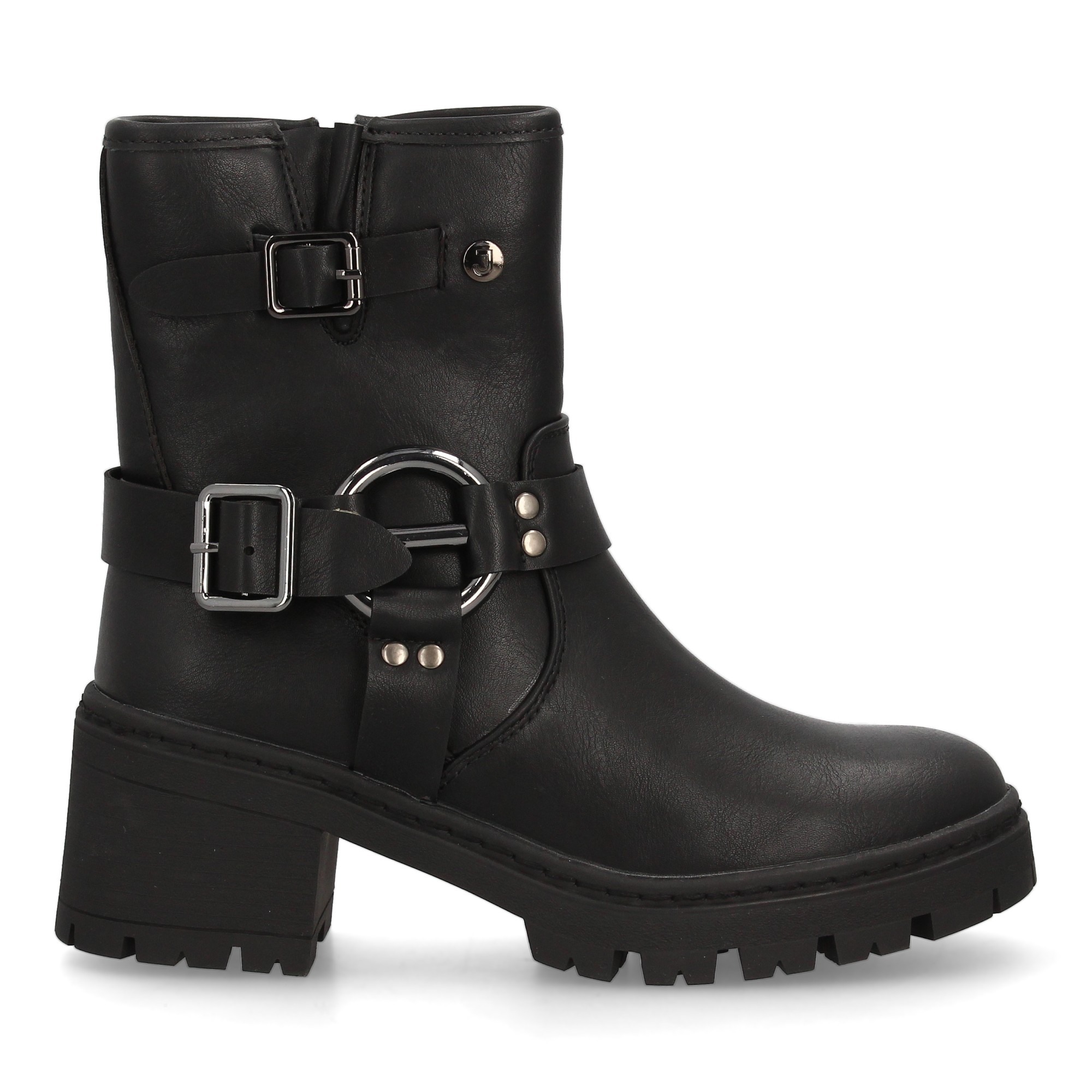 Botín de mujer estilo biker con caña media y cierre lateral de cremallera. Doble hebilla decorativa con aros metálicos. Suela gruesa con tacón ancho. Ideal otoño invierno.