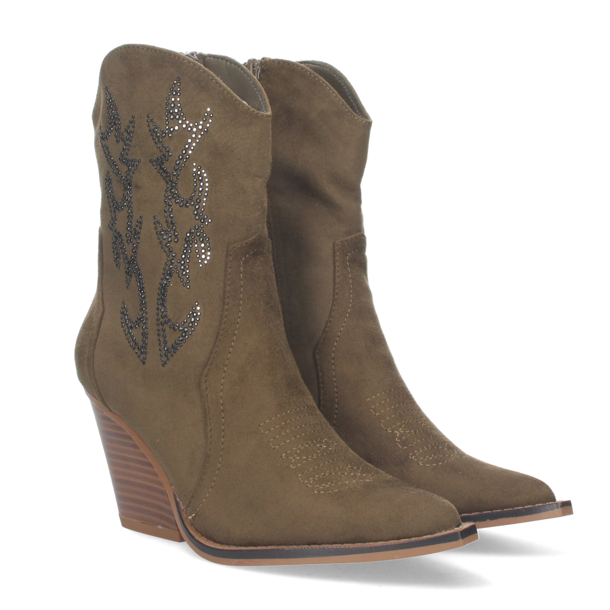 Botin campero con diseño de piedras brillantes en la caña y bordado en el empeine estilo vaquero modernizado y cierre de cremallera. La caña mide 17’5cm.