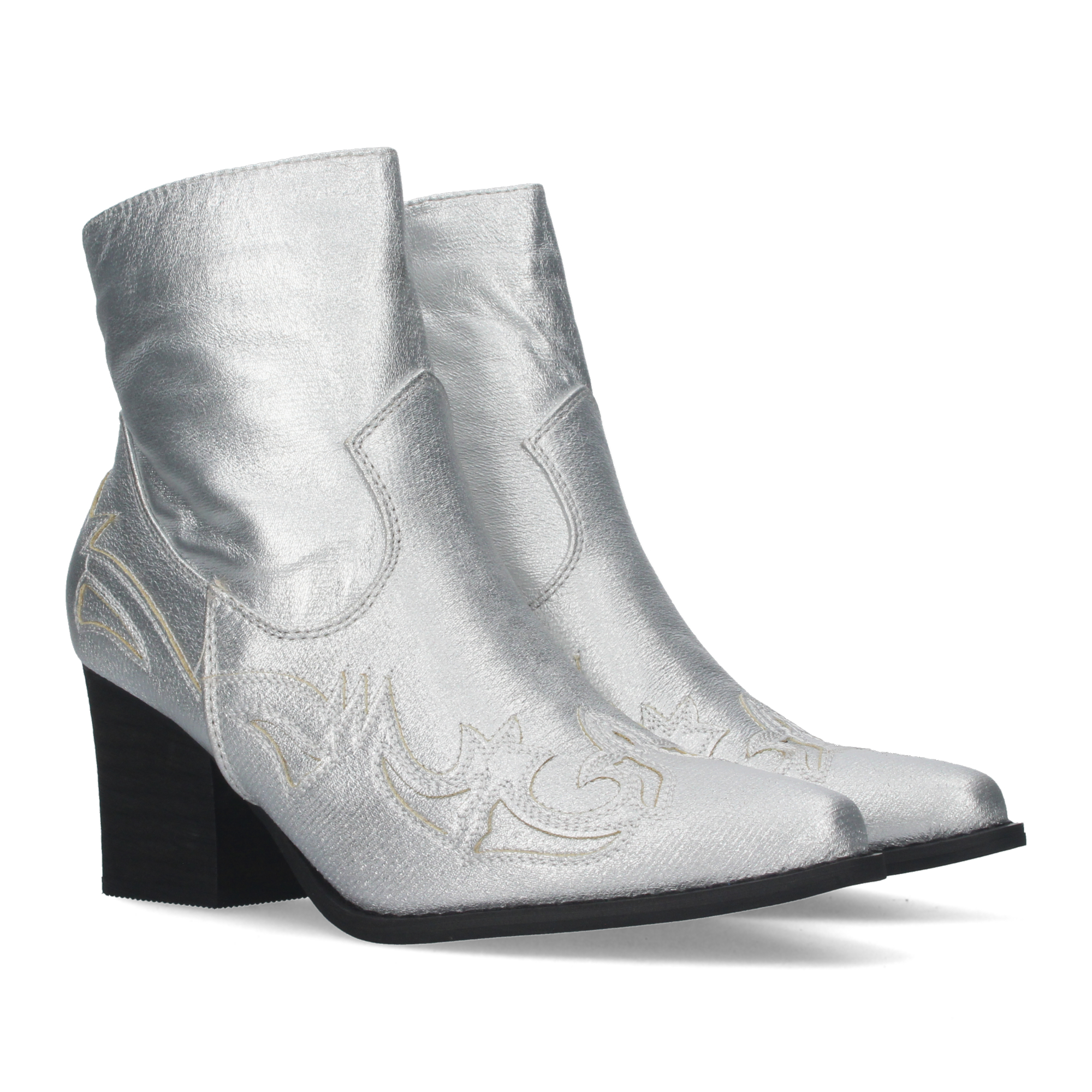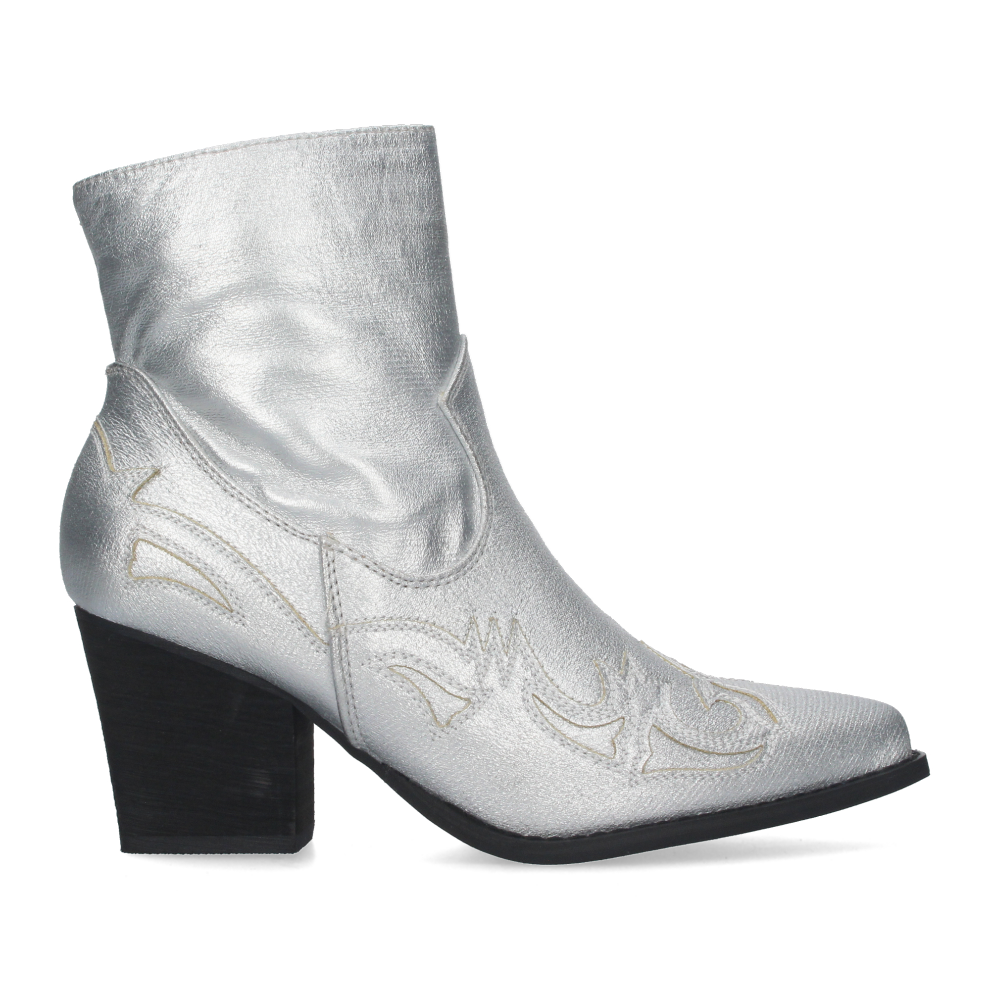 Botines camperos para mujer de tacon medio con adorno estilo cowboy en la puntera y en el talon y cierre de cremallera.