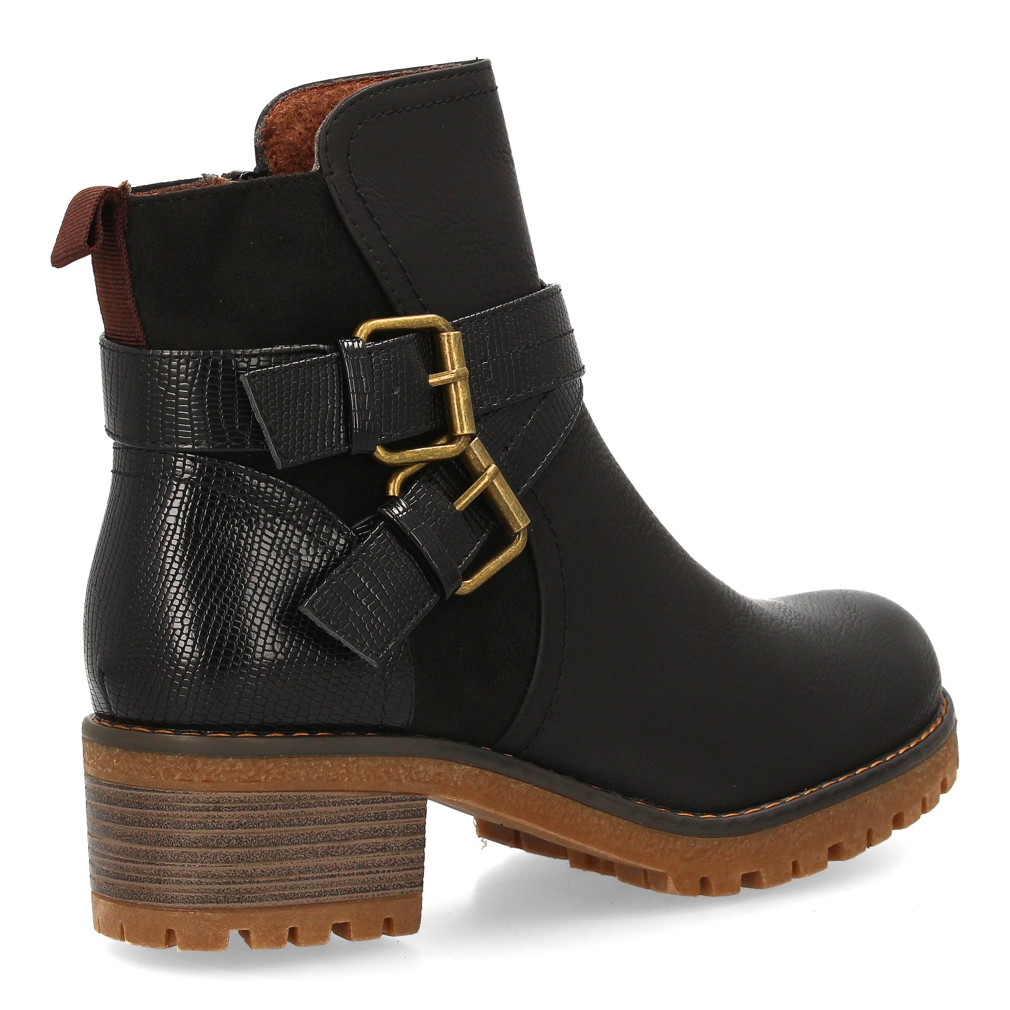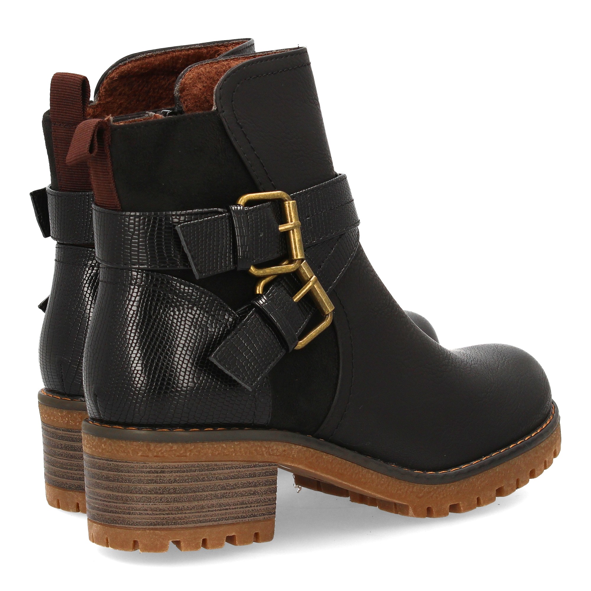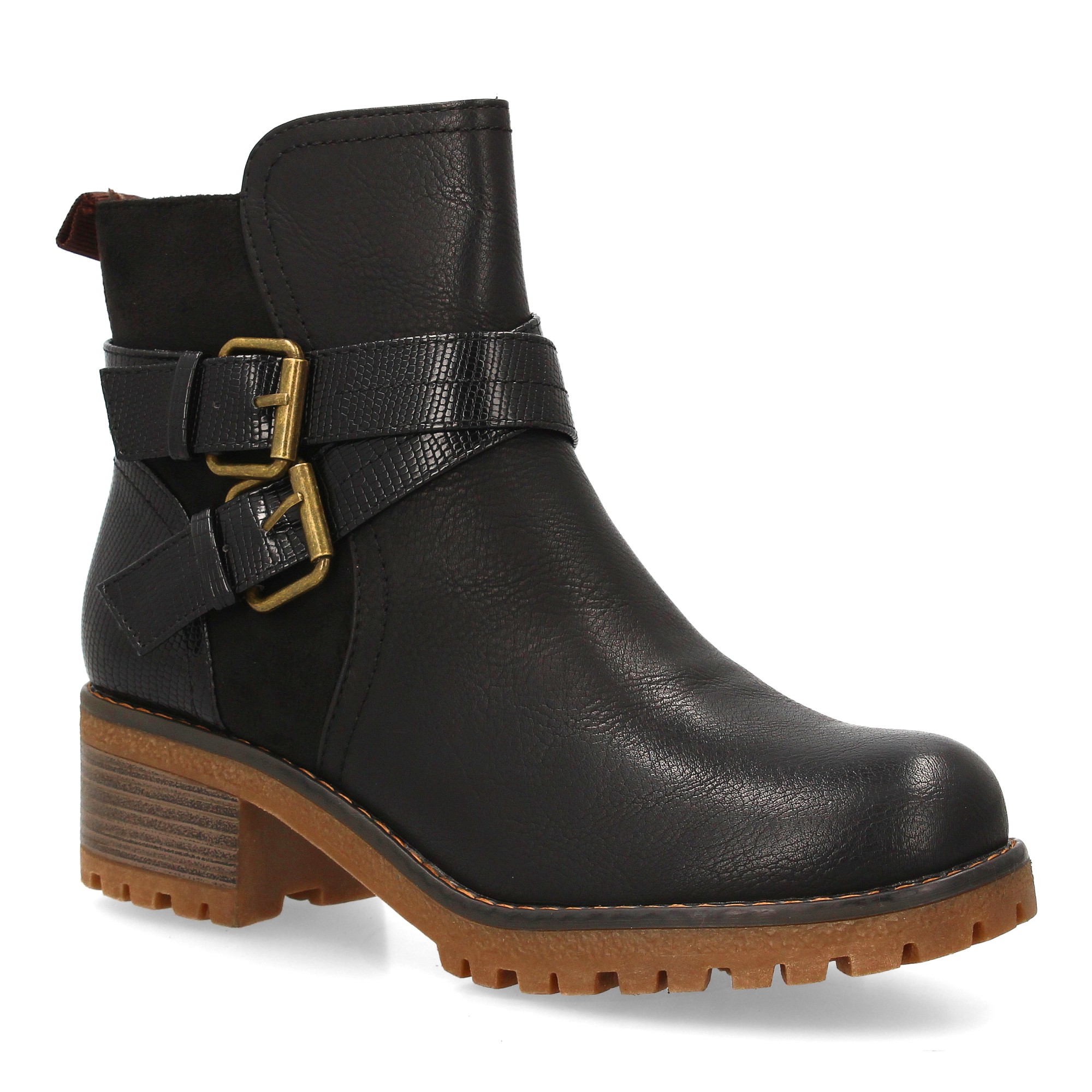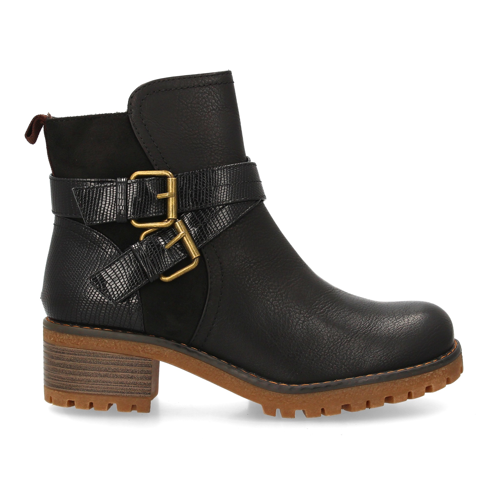 Botín de mujer con tacón. Ideal para los días de Otoño e Invierno. Texturas combinadas con doble hebilla dorada decorativa en el lateral. Suela dentada de goma. Cierre lateral con cremallera.