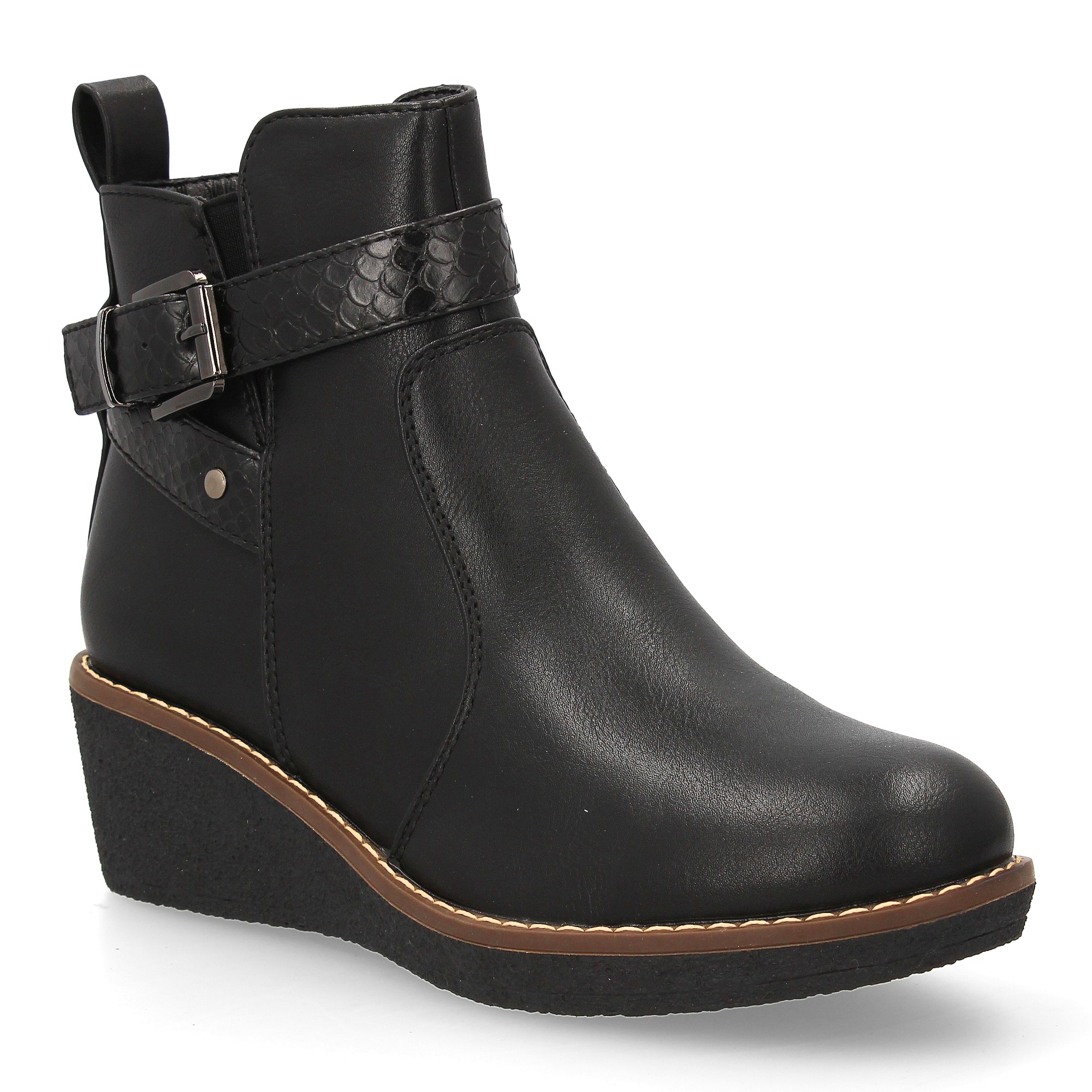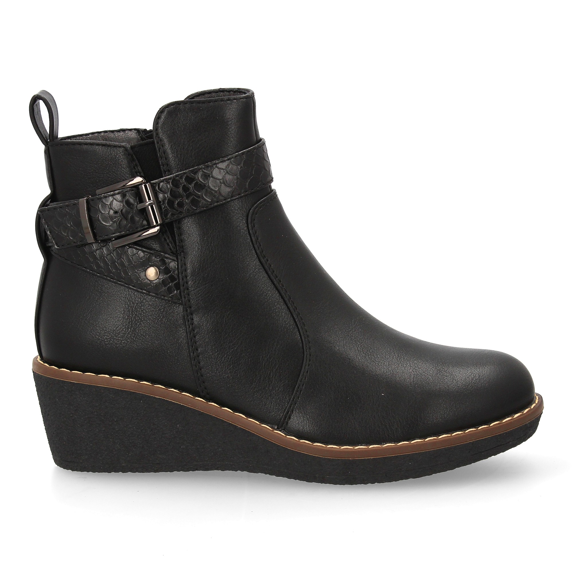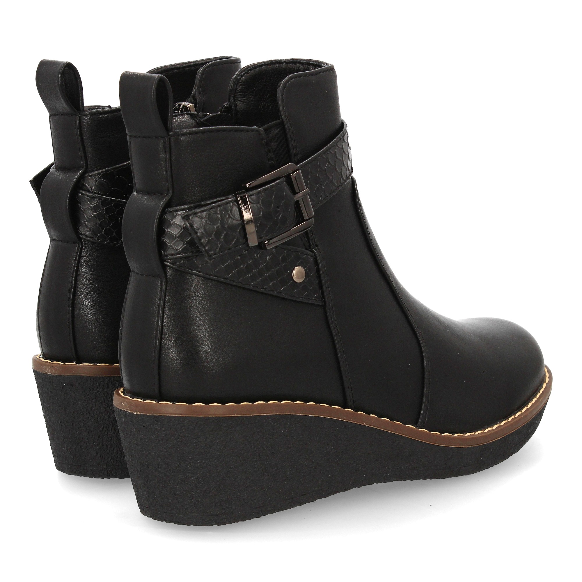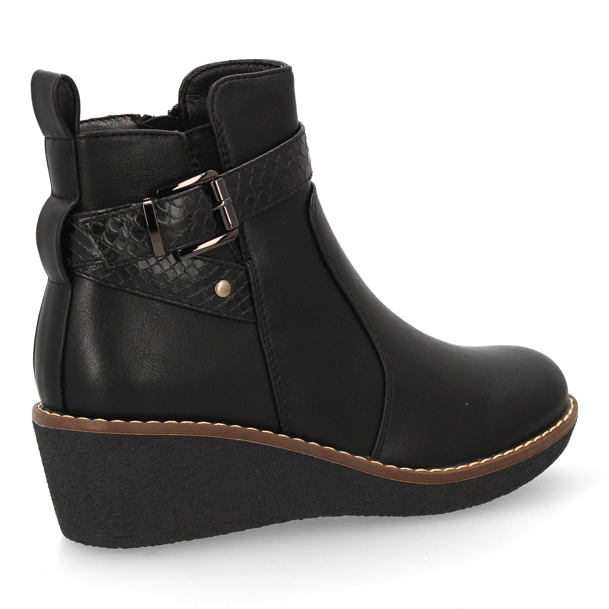 Botín con cuña para mujer elegante tira con textura de efecto serpiente y hebilla decorativa metálica en el lateral exterior. Cremallera interior ideal para la temporada de otoño invierno.
