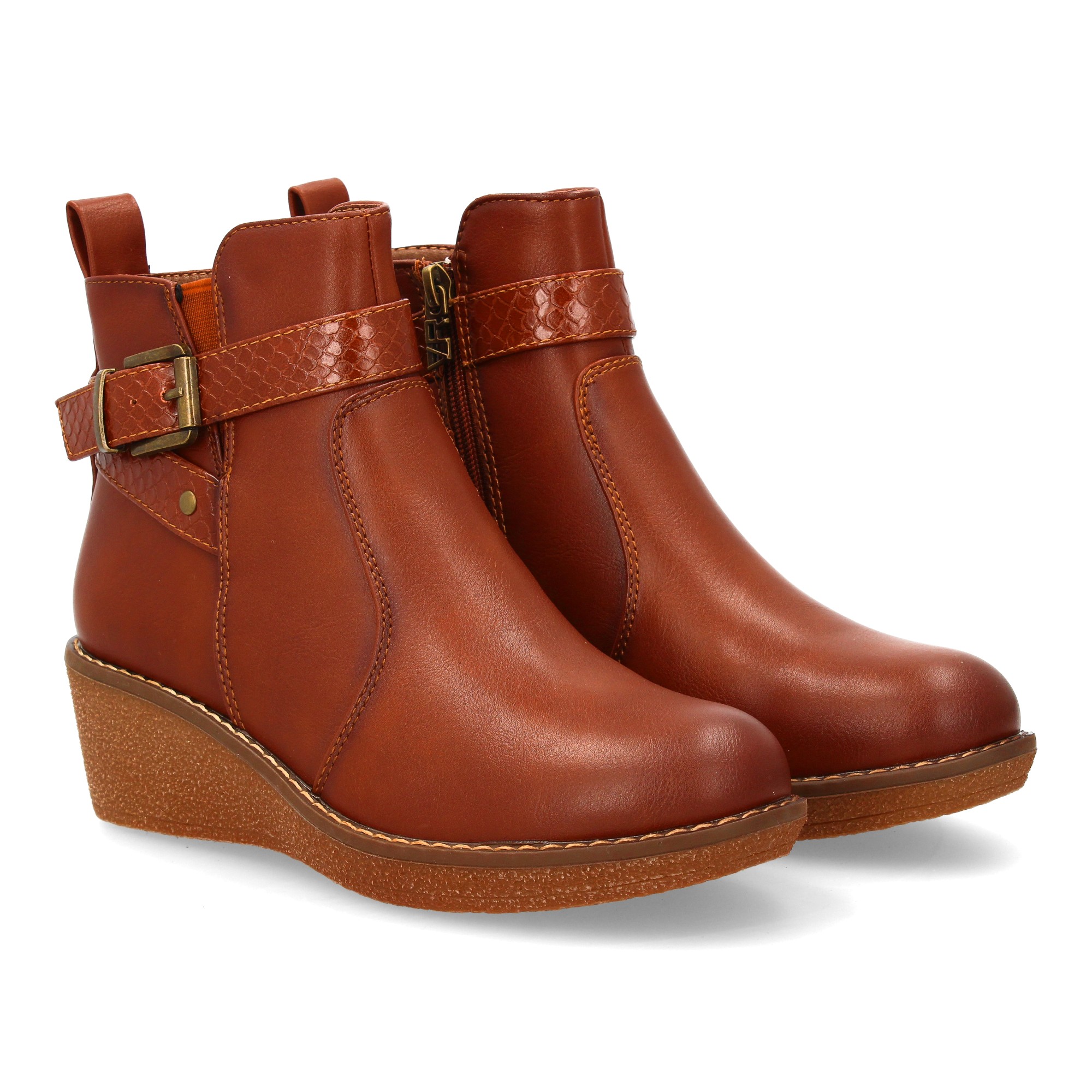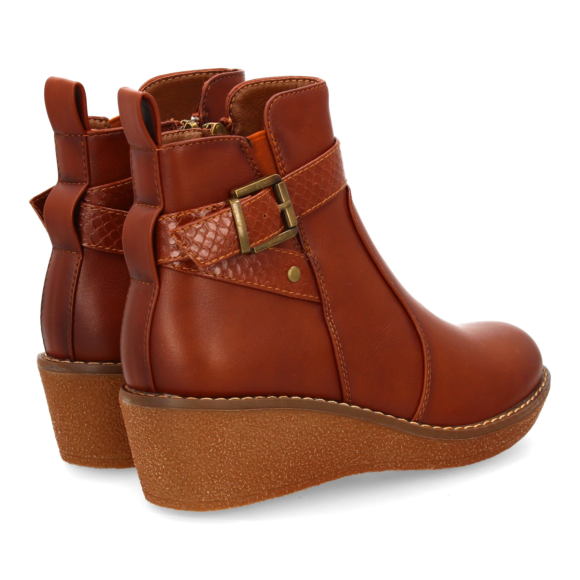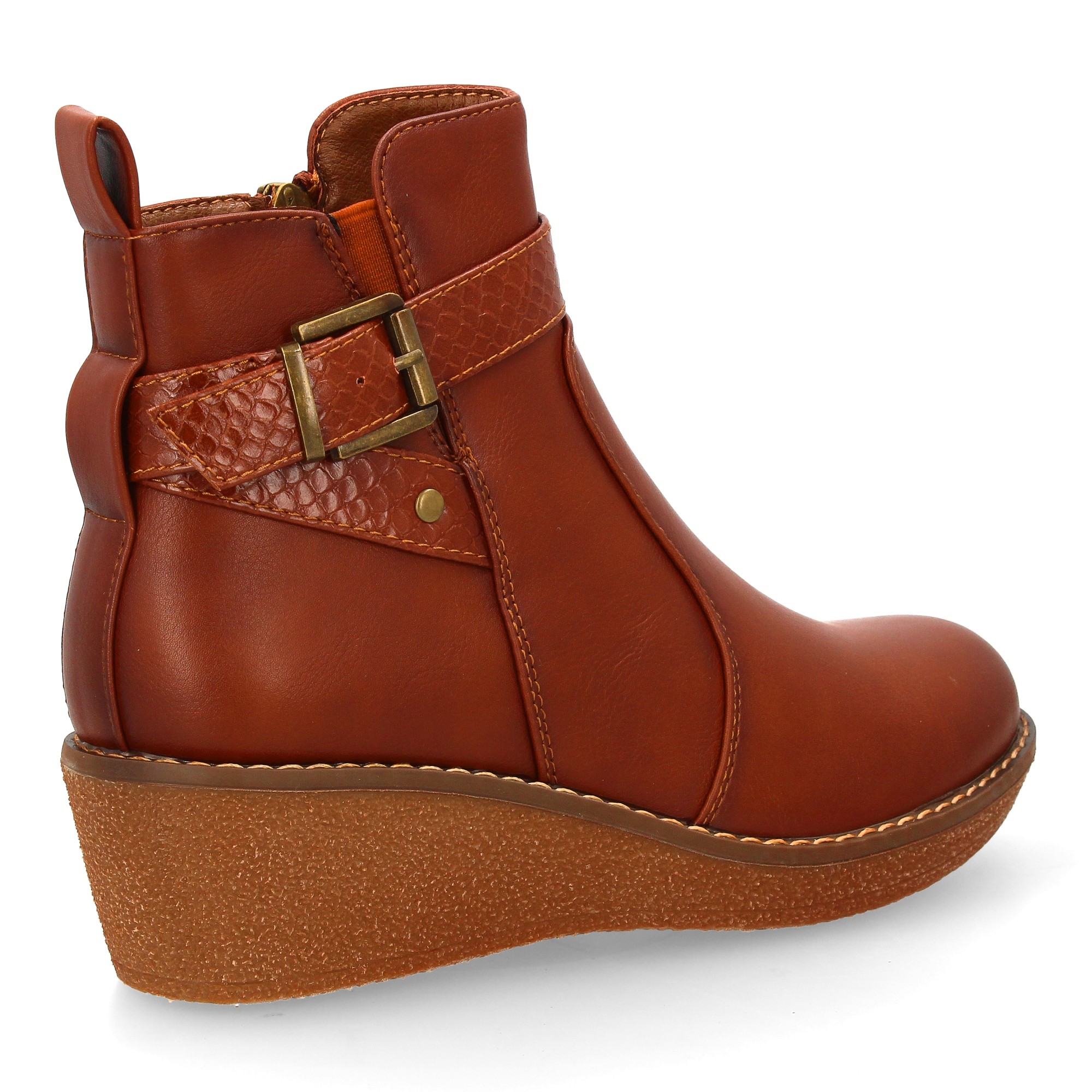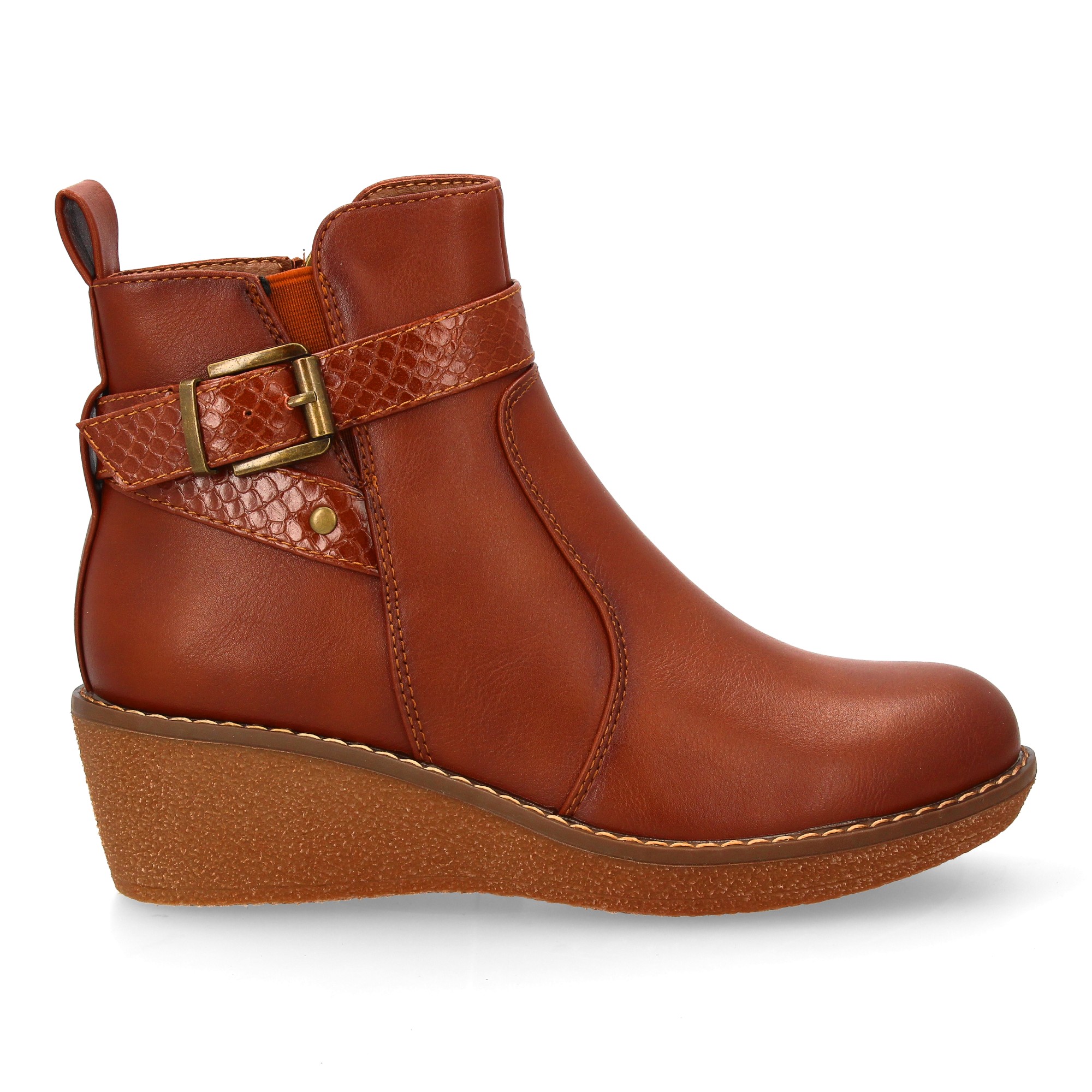 Botín con cuña para mujer elegante tira con textura de efecto serpiente y hebilla decorativa metálica en el lateral exterior. Cremallera interior ideal para la temporada de otoño invierno.