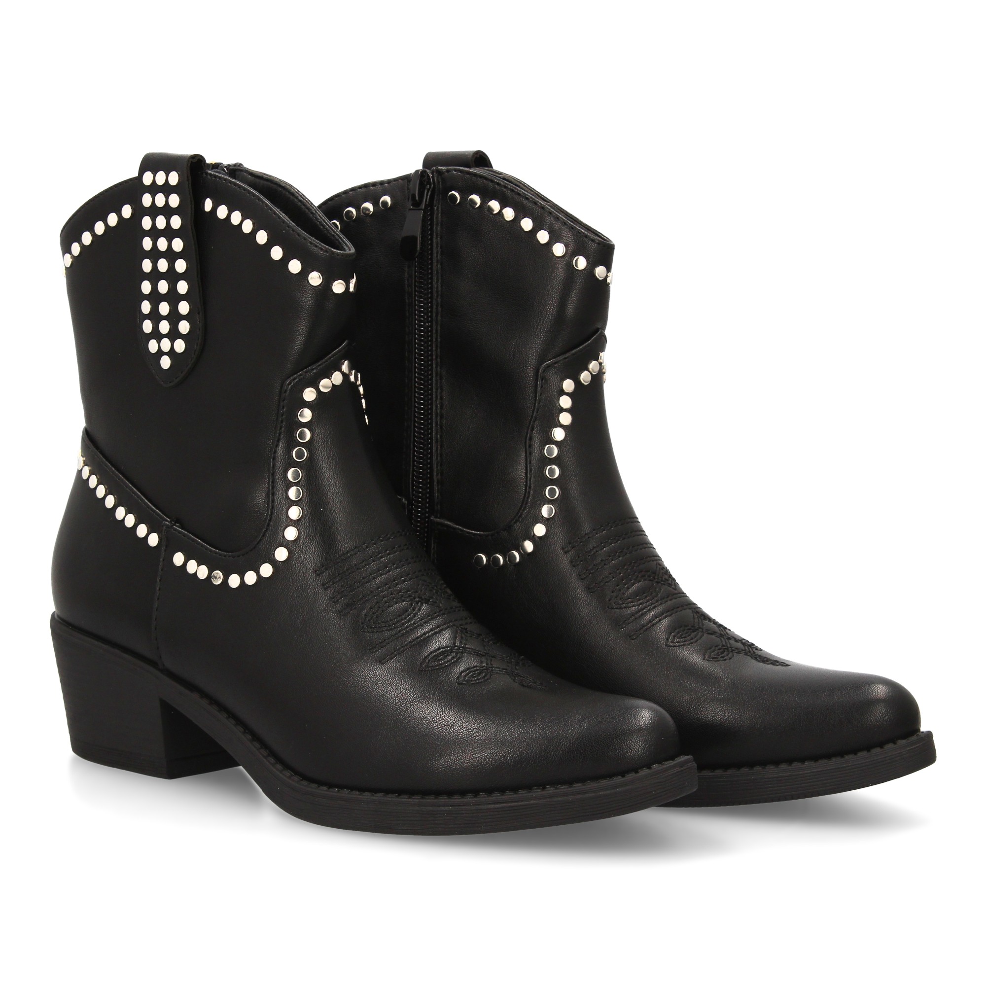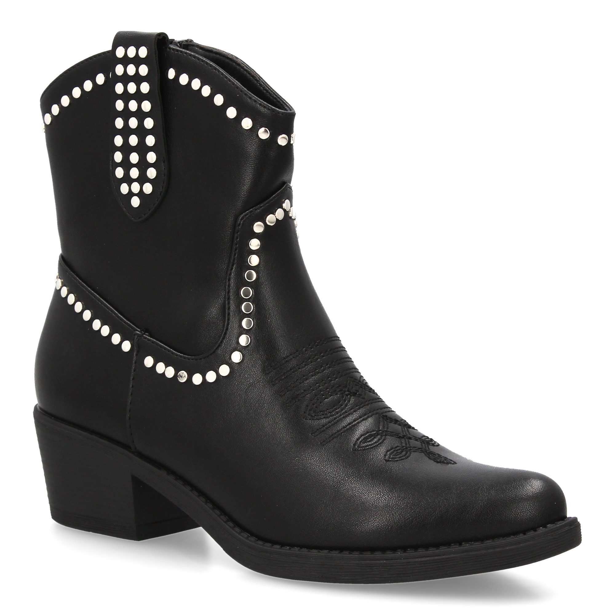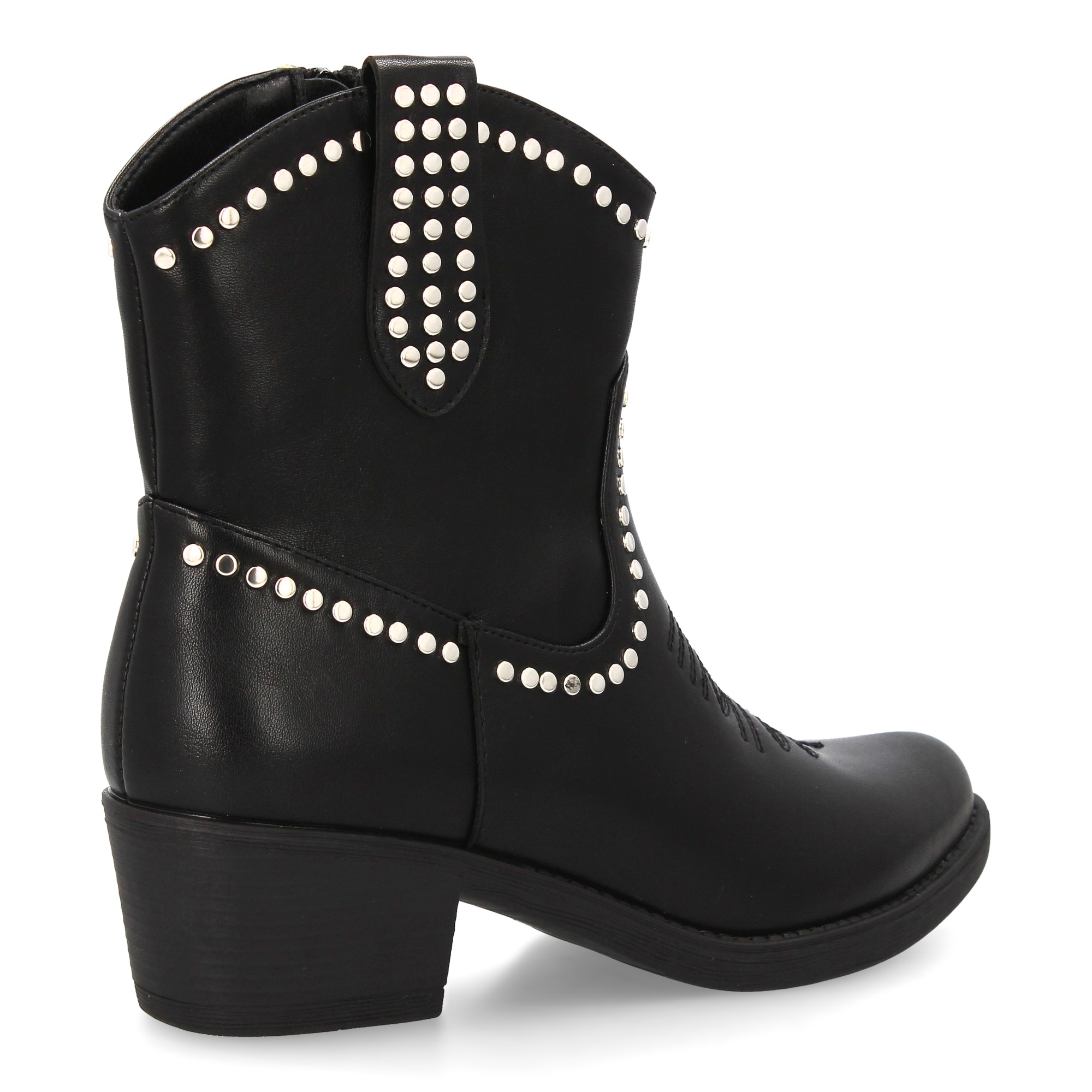 Botín cowboy para mujer con tachuelas. Tacón bajo estampado liso y cierre de cremallera para temporada otoño invierno.