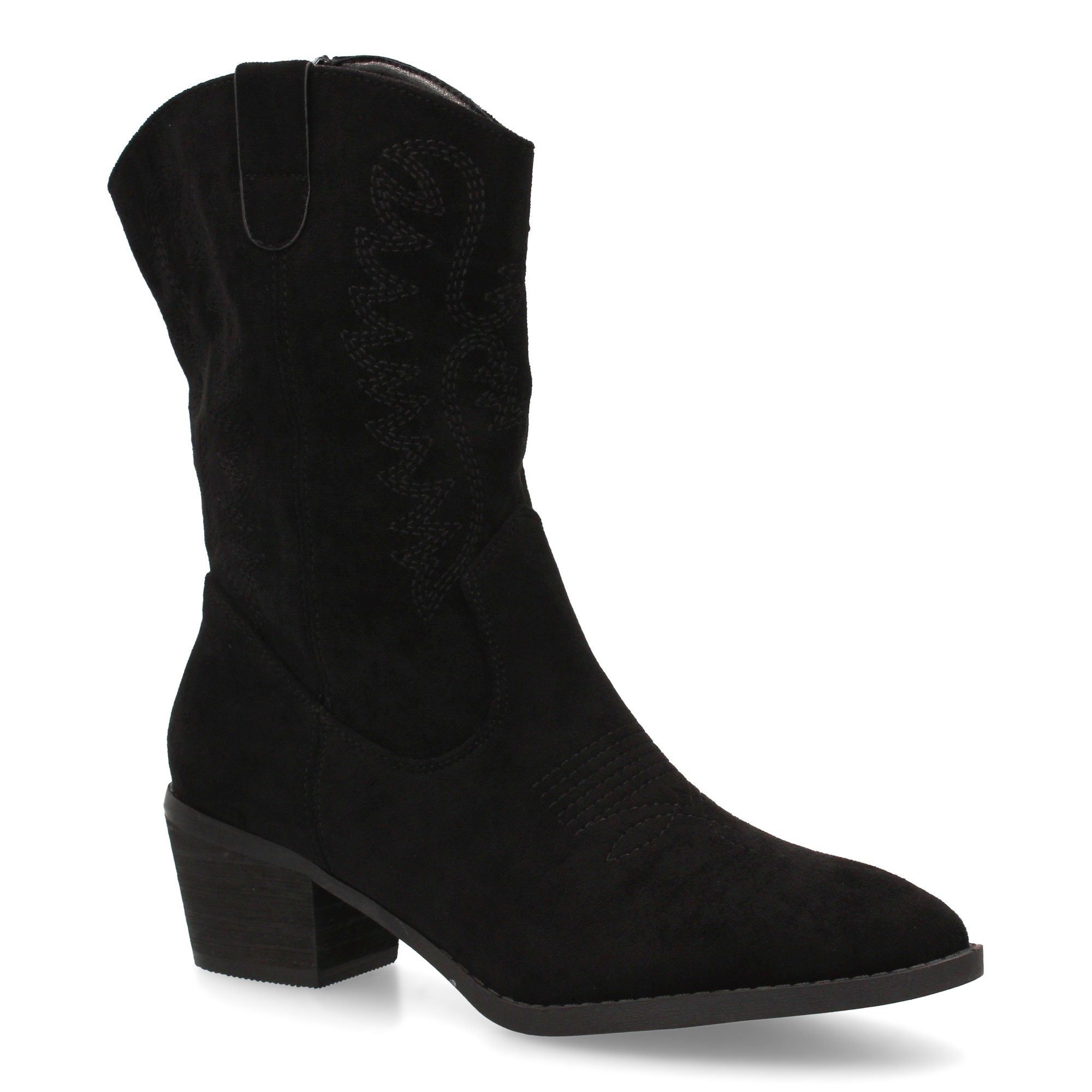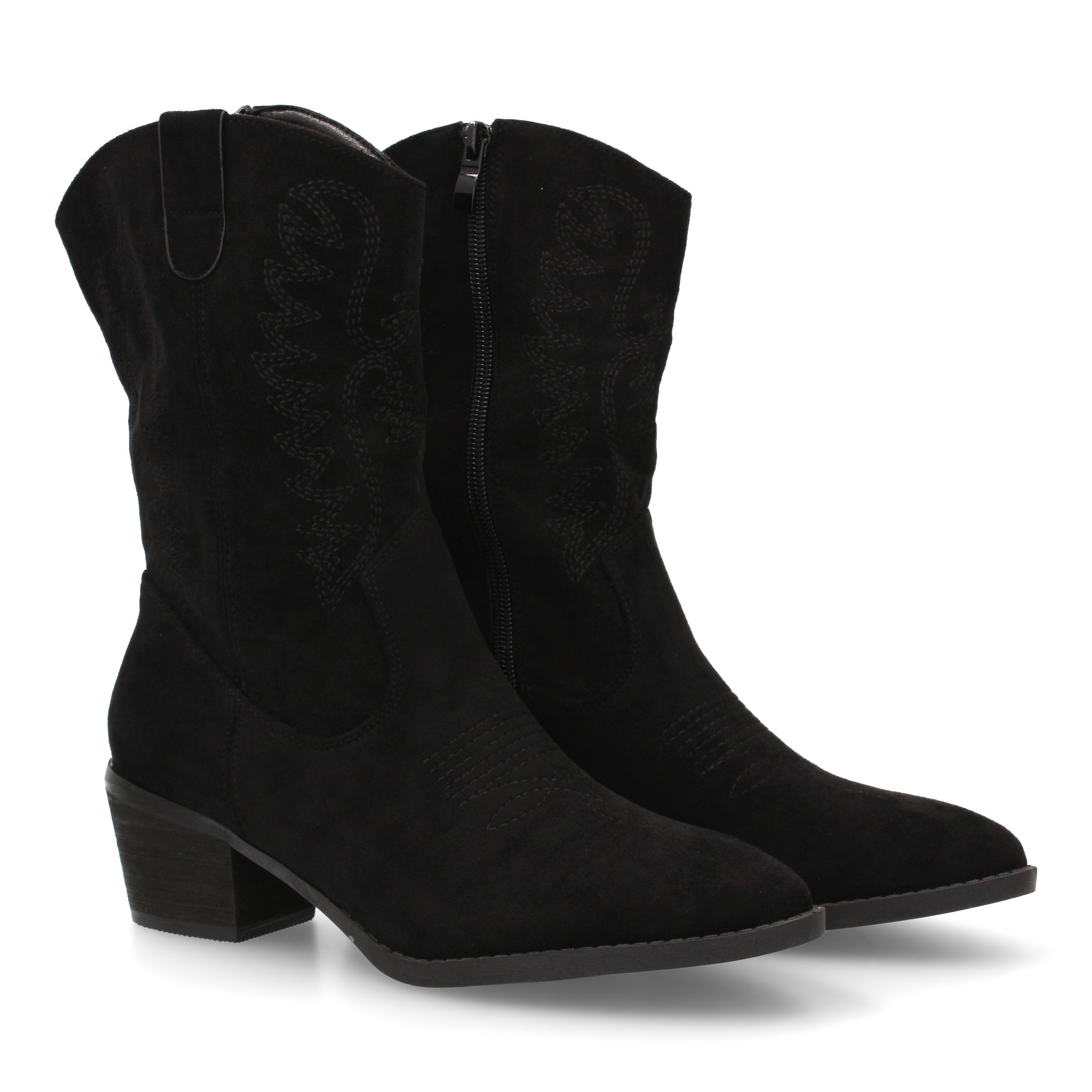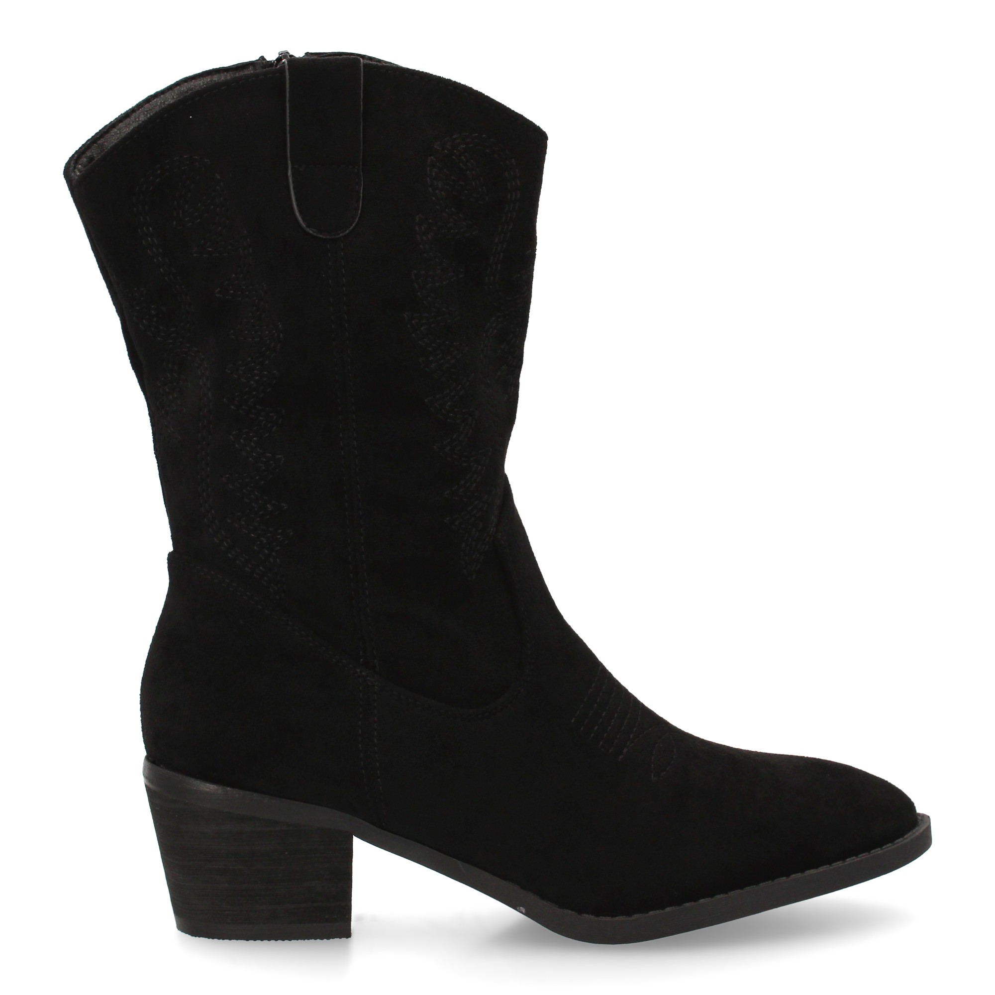 Bota cowboy de caña media con bordados frontales y laterales punta fina. Tacón ancho comodo ideal para mujer en temporada Otoño invierno. Cierre de cremallera.