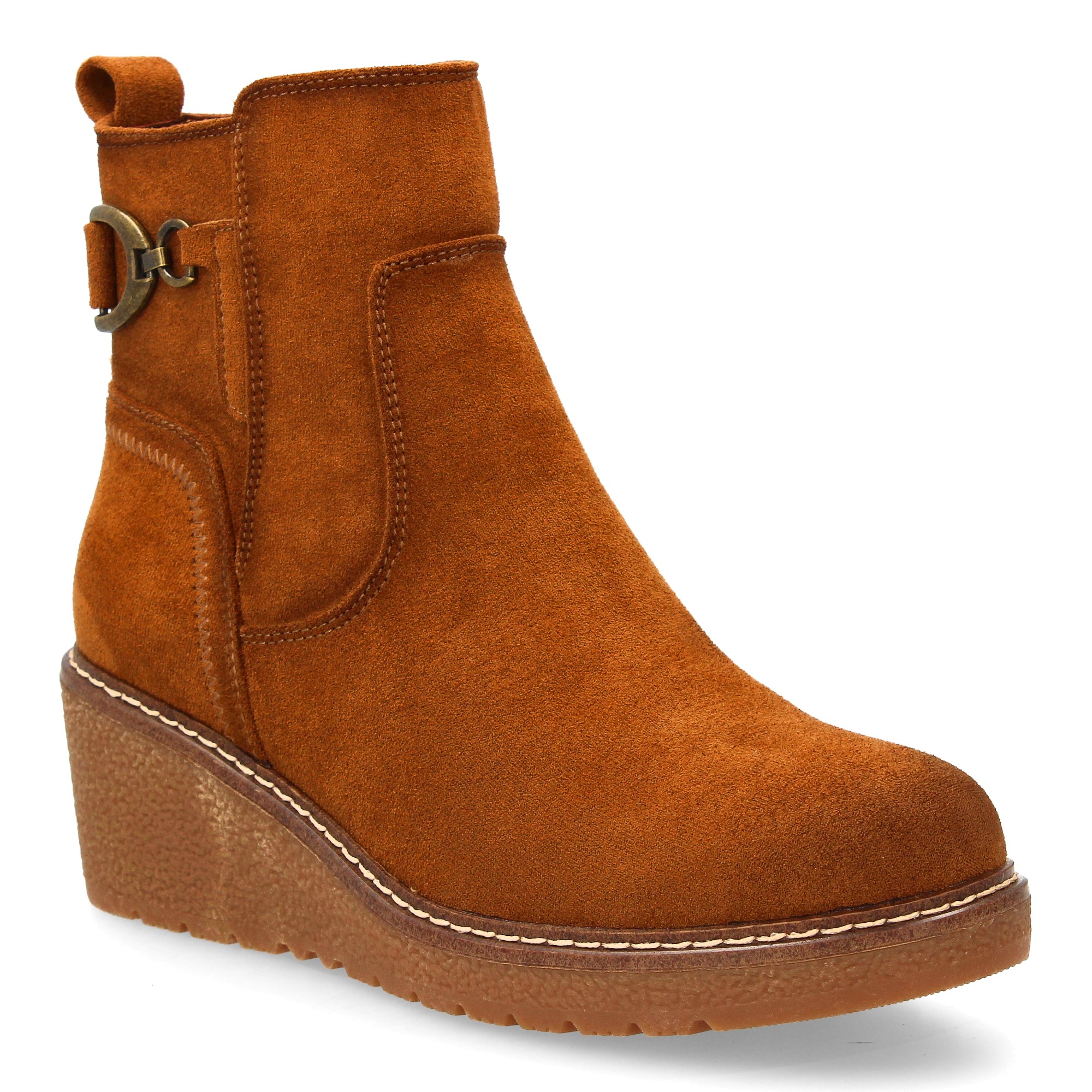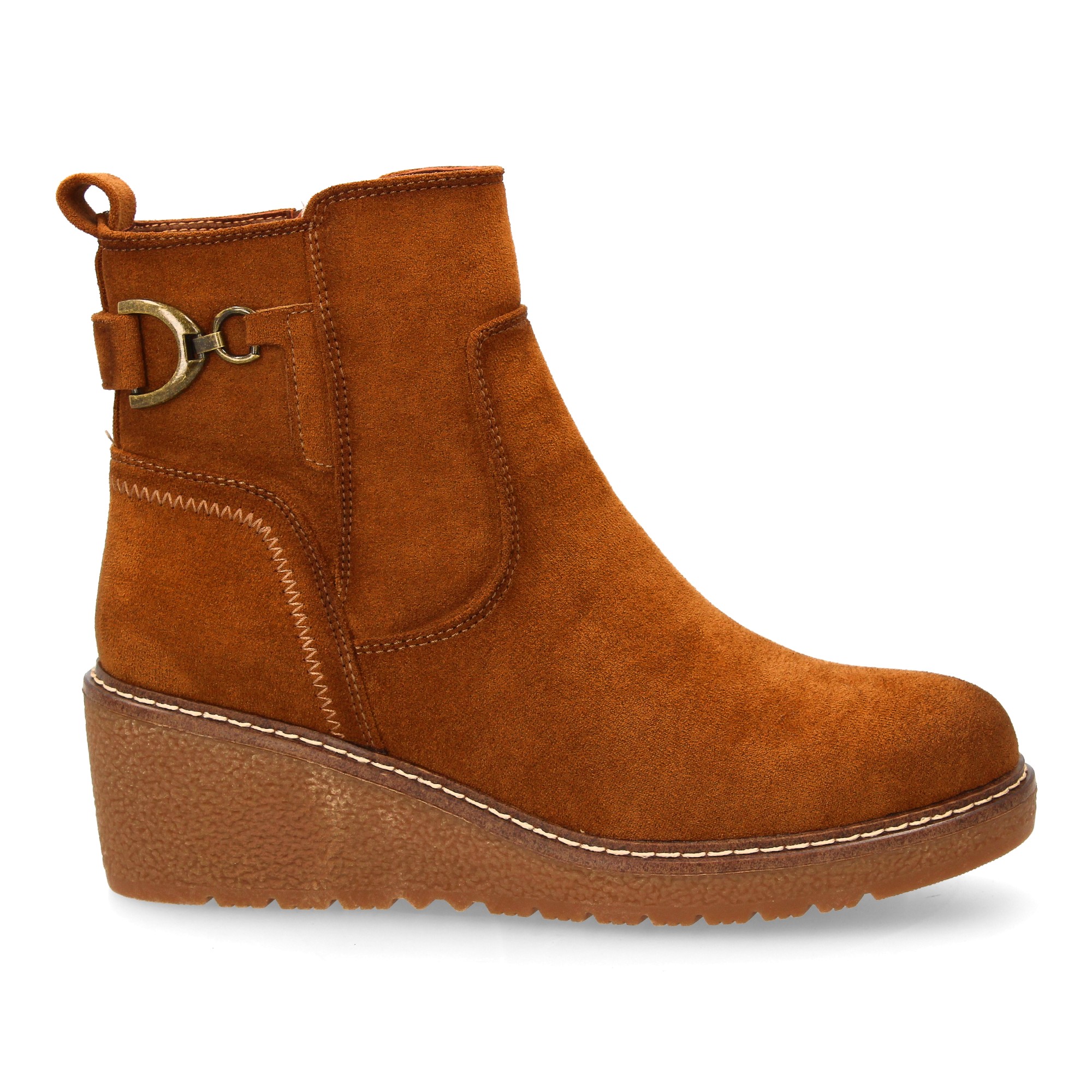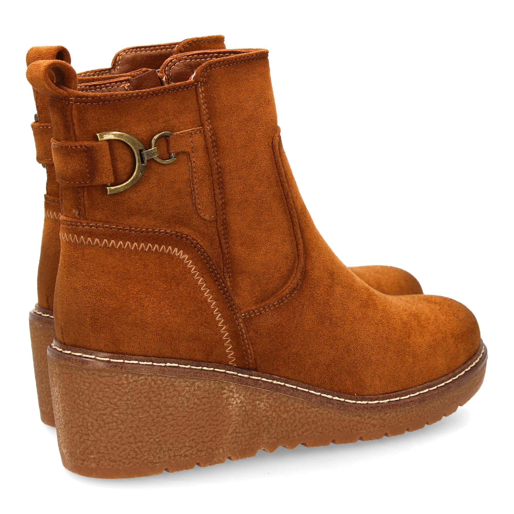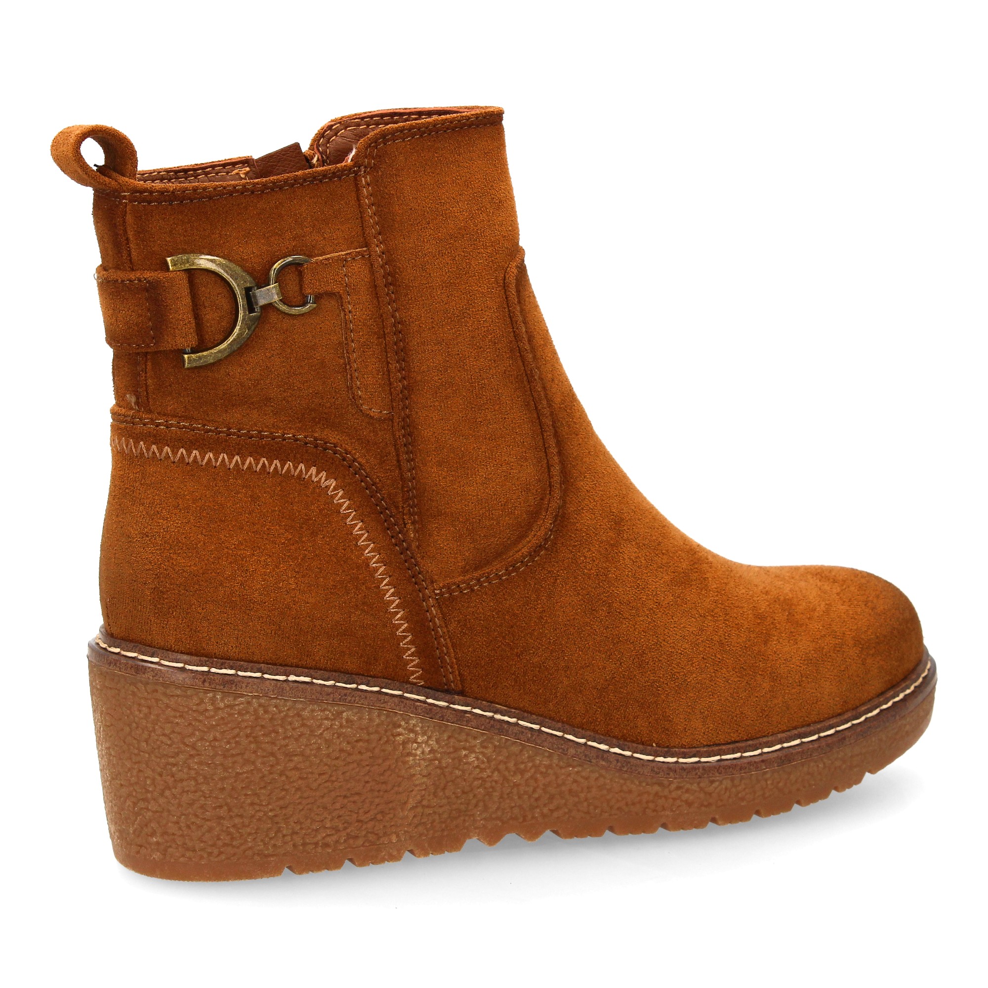 Botín para mujer con cuña cómoda para usar en el día a día. Diseño de adorno metálico lateral con estribo cierre interior de cremallera.