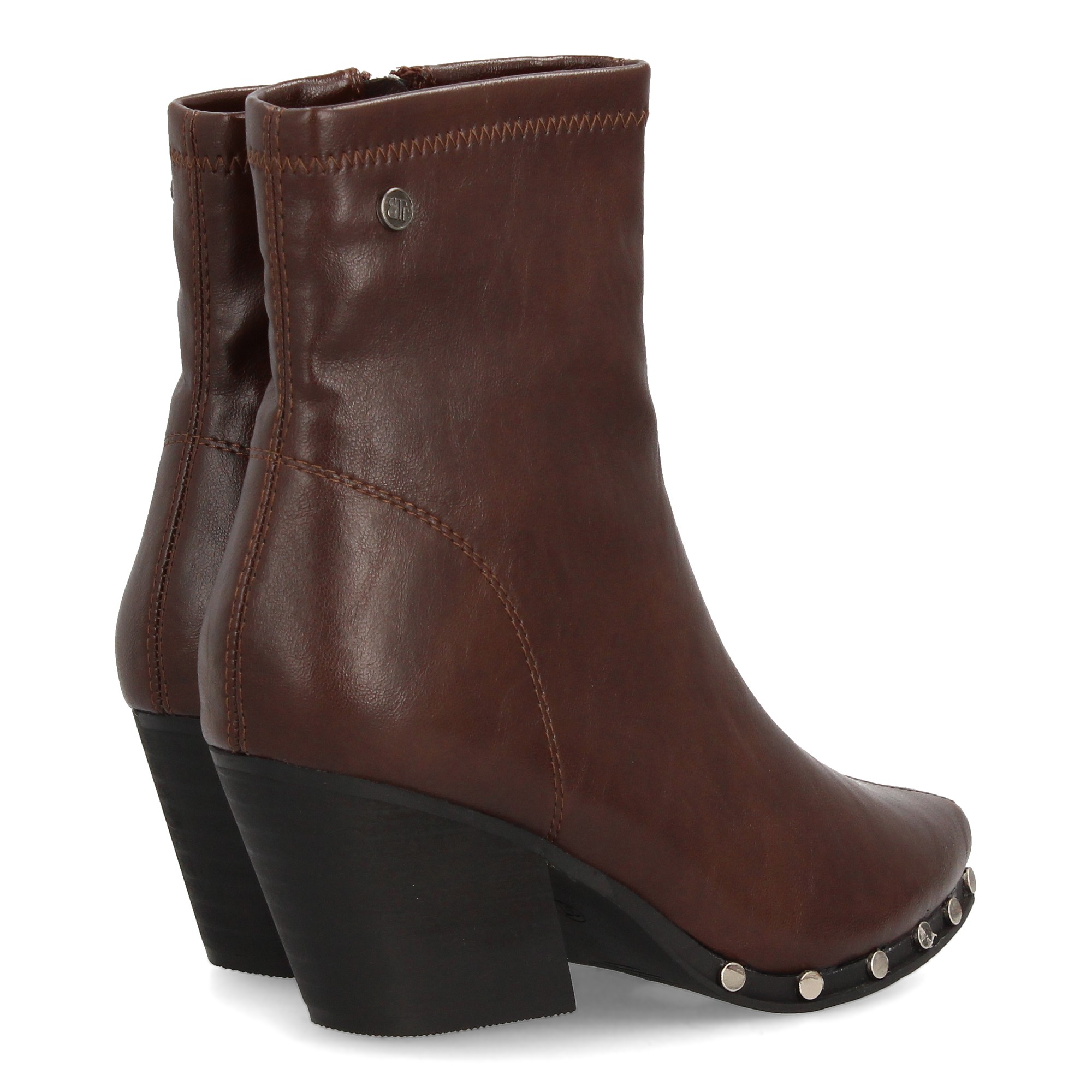 Botín de mujer con tacón cubano detalles de tachuelas estilo moderno acabado en pico estampado liso cierre lateral de cremallera ideal Otoño Invierno.