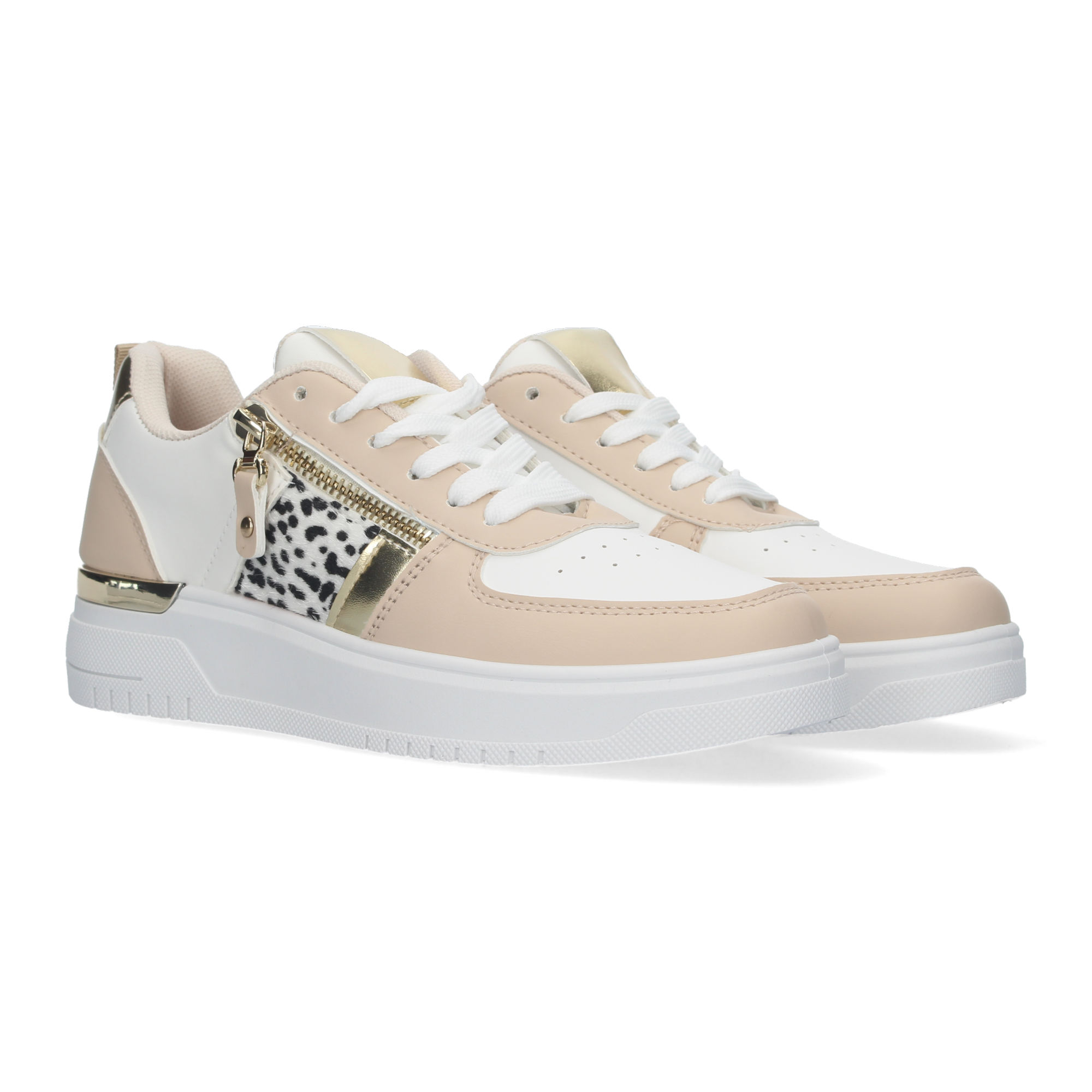 Zapatillas de mujer cómodas de color blanco con detalles de animal print y dorado y adorno de cremallera dorada