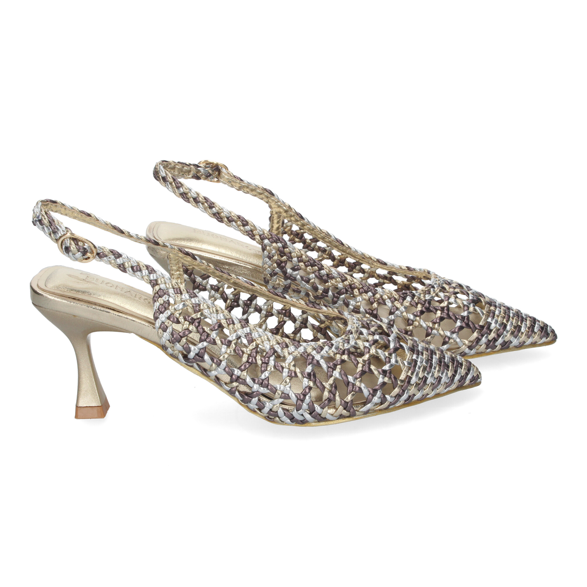 Zapato de Tacon Fino para Mujer Cómodo y Elegante Estilo Salon de Punta Fina de Material Entrelazado y Cierre de Hebilla.