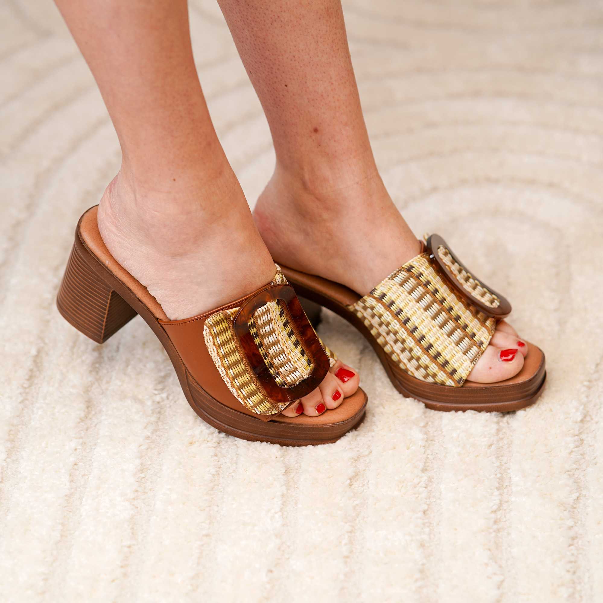 Zueco de tacon comodos y elegantes diseño moderno bicolor con hebilla decorativa en la pala ideales para primavera verano.